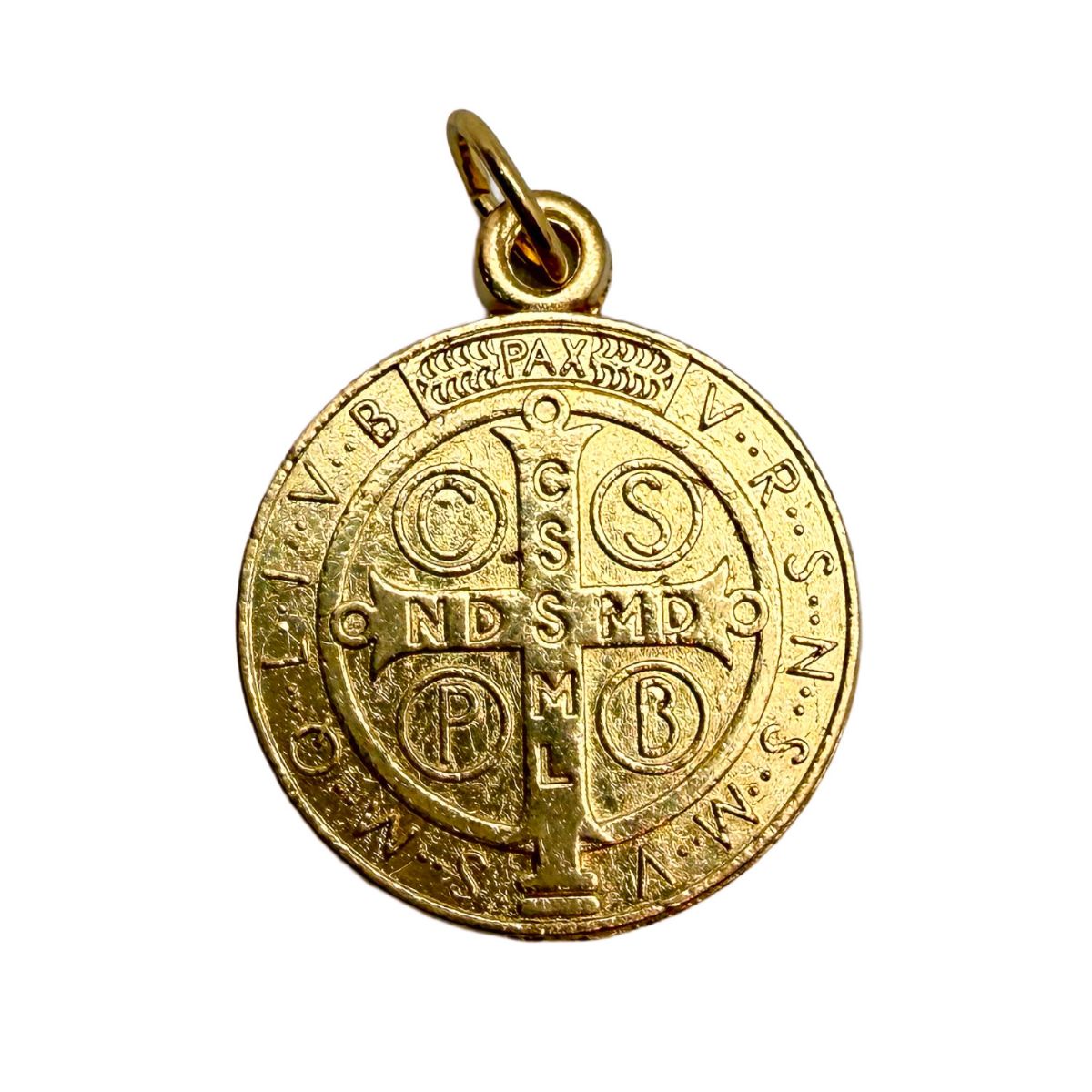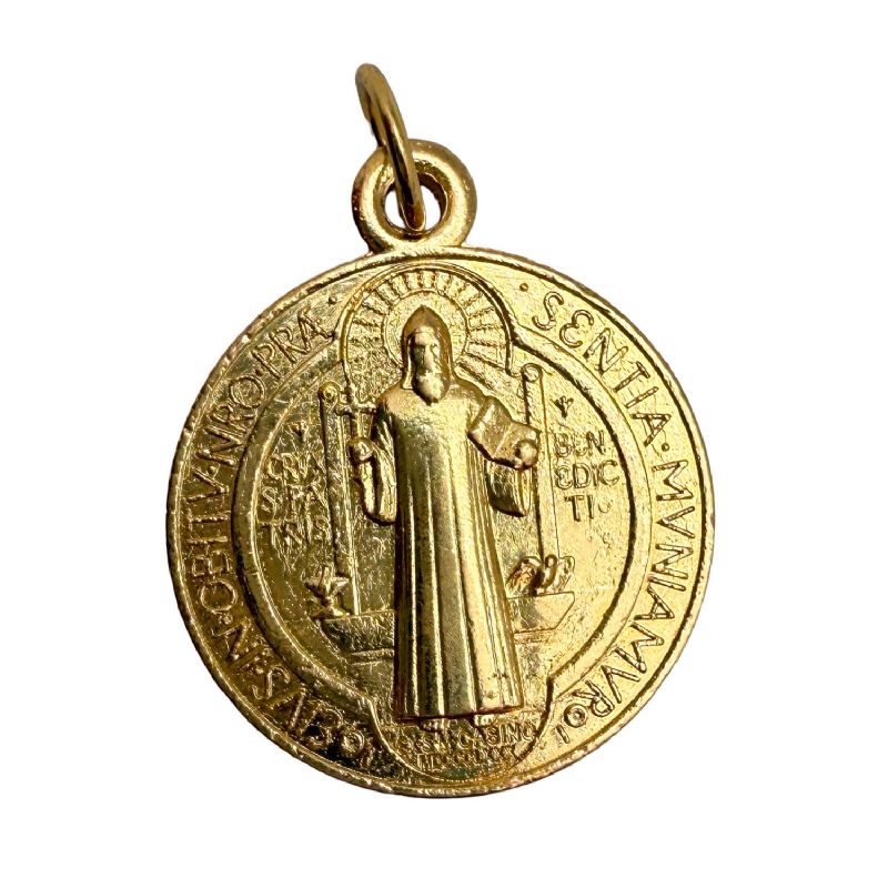 Medalla de San Benito de 2,1 cm elaborada en metal dorado con acabado brillante.