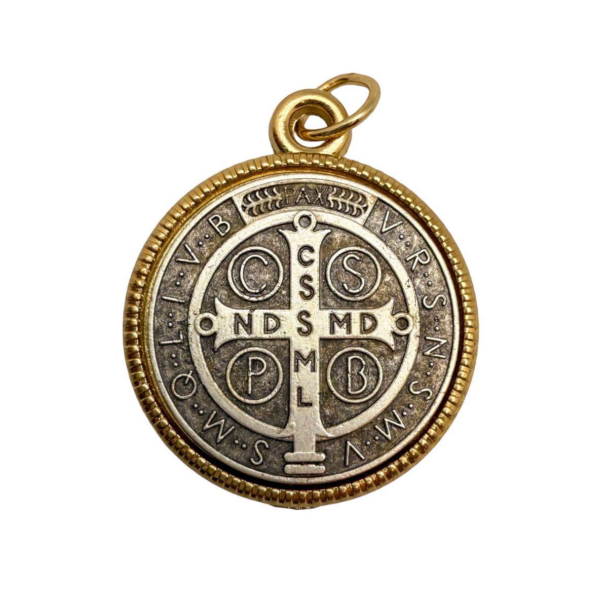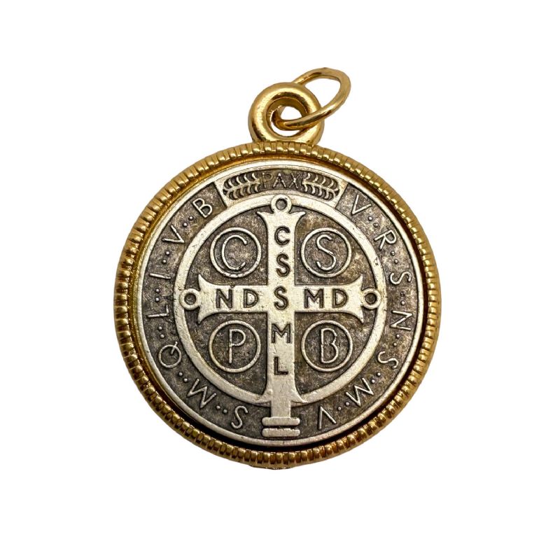 Medalla de San Benito de 2,4 cm elaborada en metal plateado con anillo dorado.