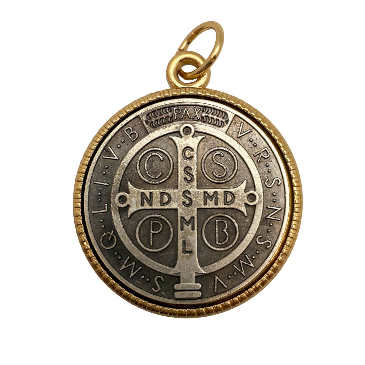 Medalla de San Benito de 3,4 cm, elaborada en metal plateado con borde dorado.