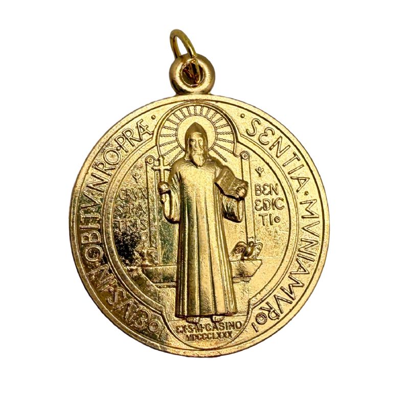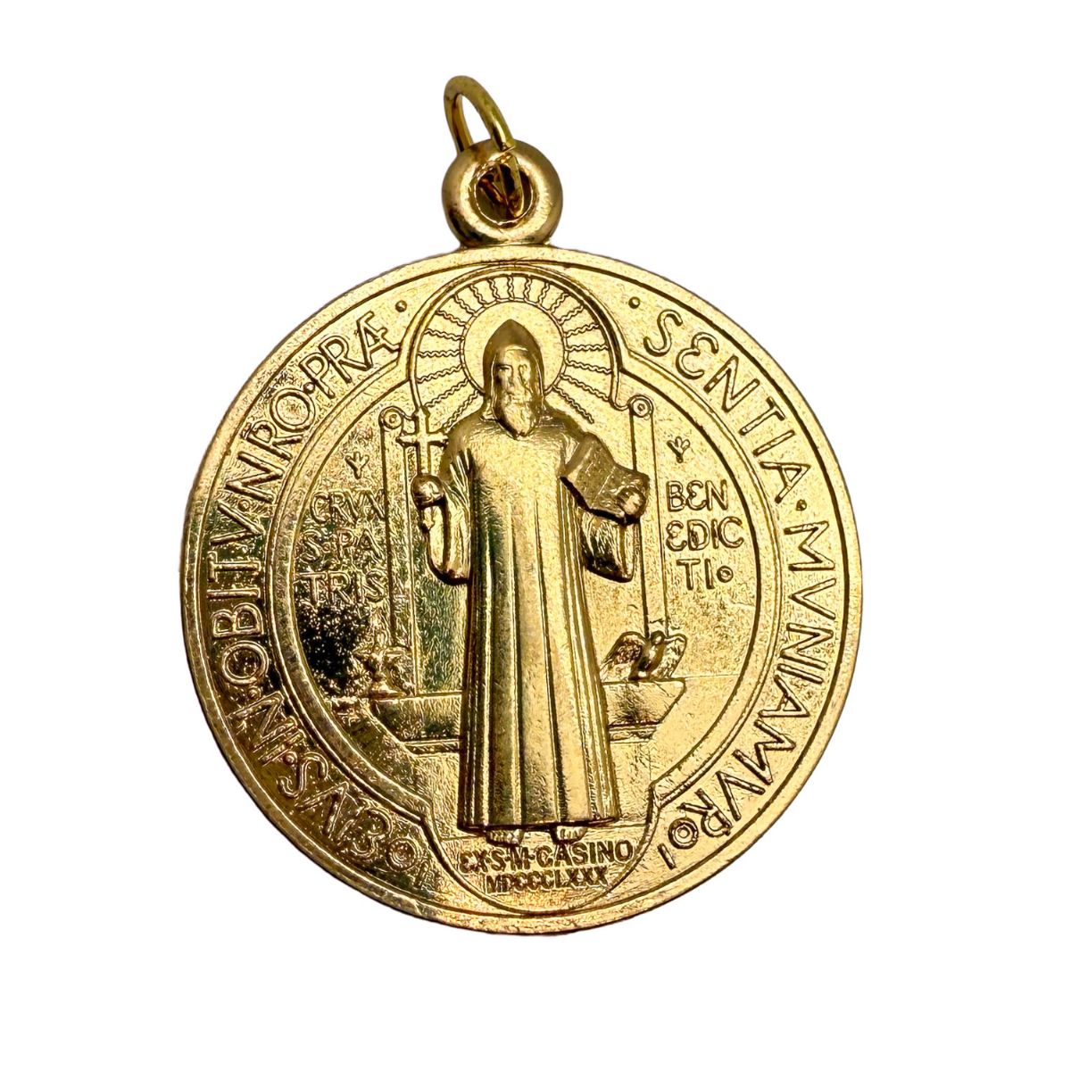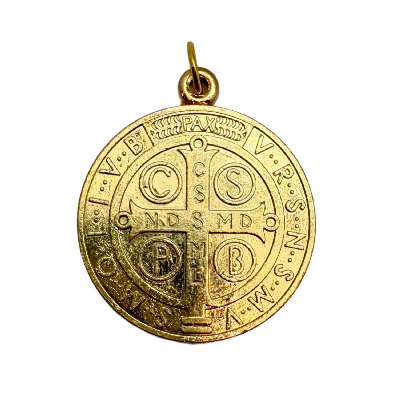 Medalla de San Benito de 3 cm, realizada en metal dorado con acabado brillante.