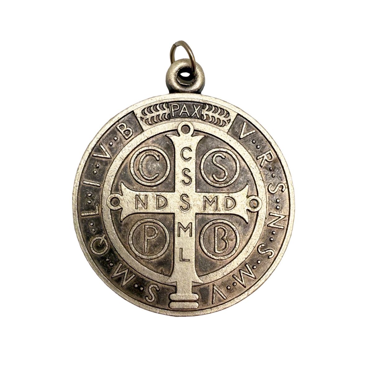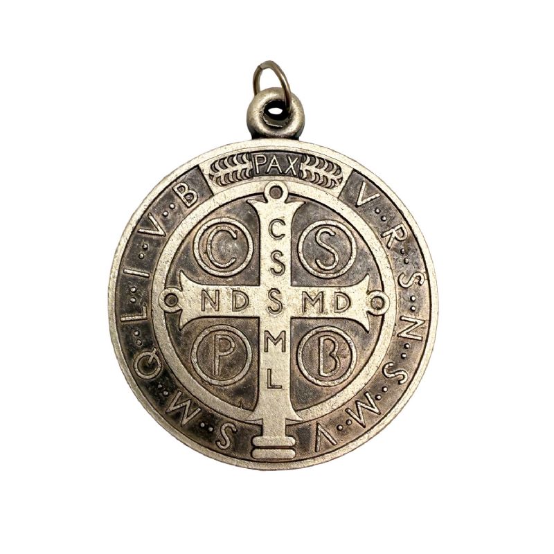 Medalla de San Benito de 3,6 cm realizada en metal plateado, con acabado envejecido.