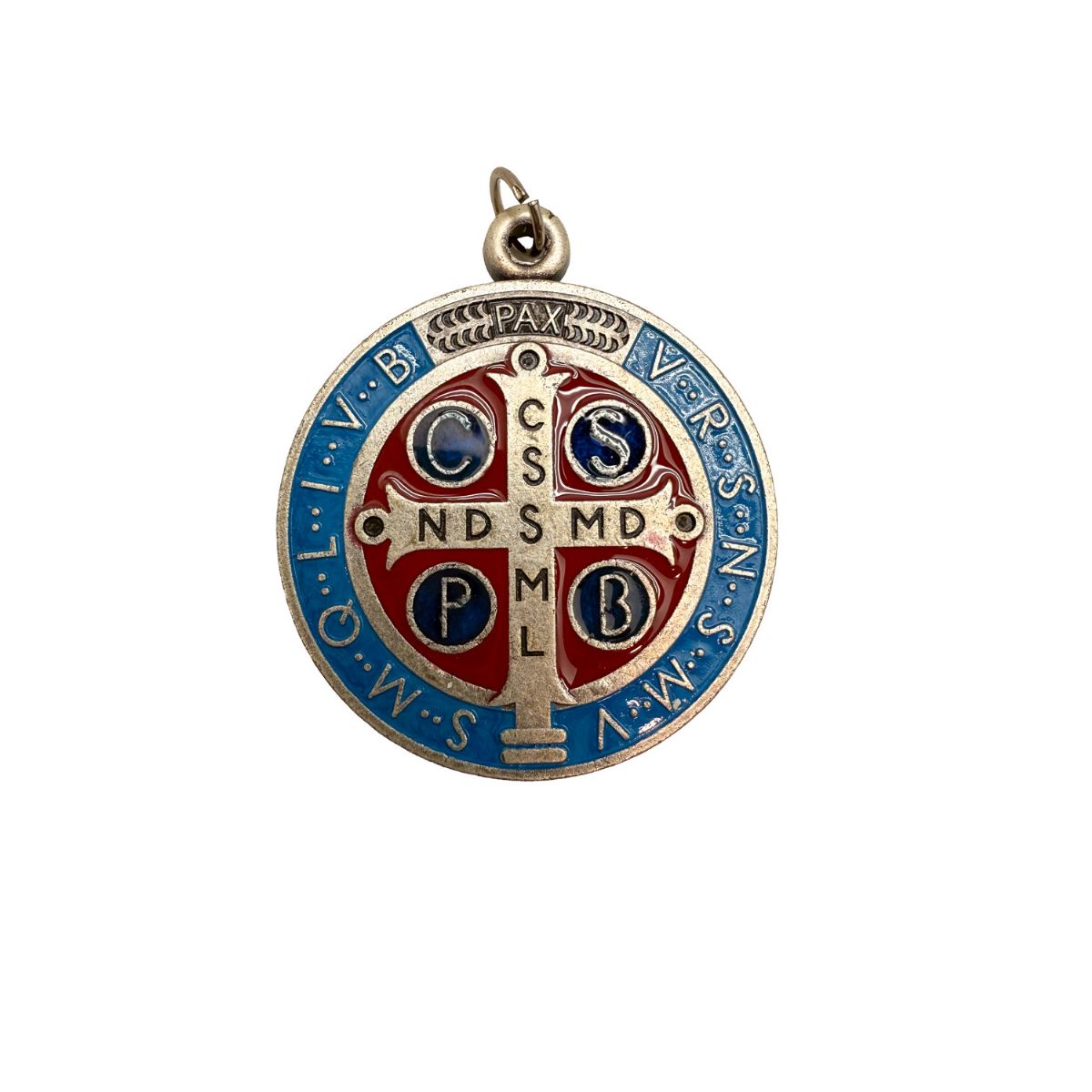 Medalla de San Benito de 3,6 cm elaborada en metal esmaltado, con acabado bicolor en tonos azul y rojo.