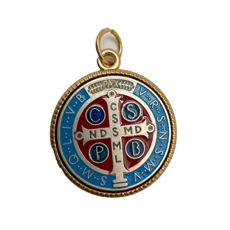 Medalla de San Benito con anillo dorado y esmalte a color, elaborada en metal fundido de gran calidad.