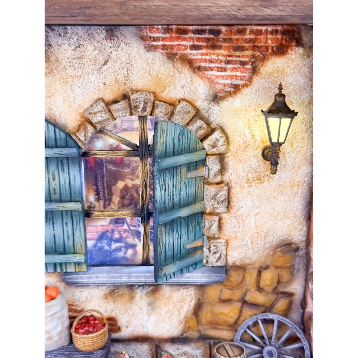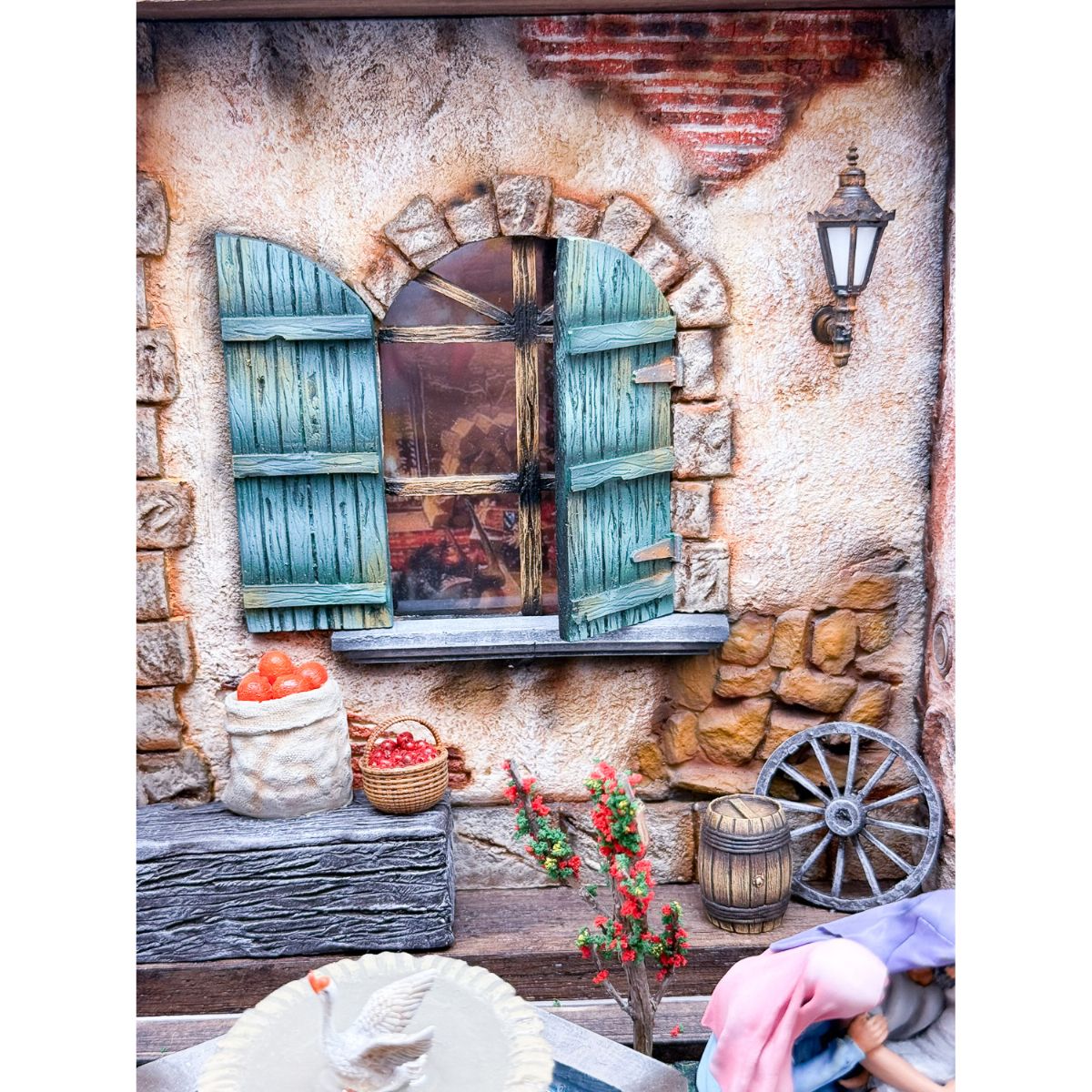 El interior reproduce un rincón de aldea con paredes texturizadas, ventanales con contraventanas verdes, suelo empedrado y fuente con agua en relieve.