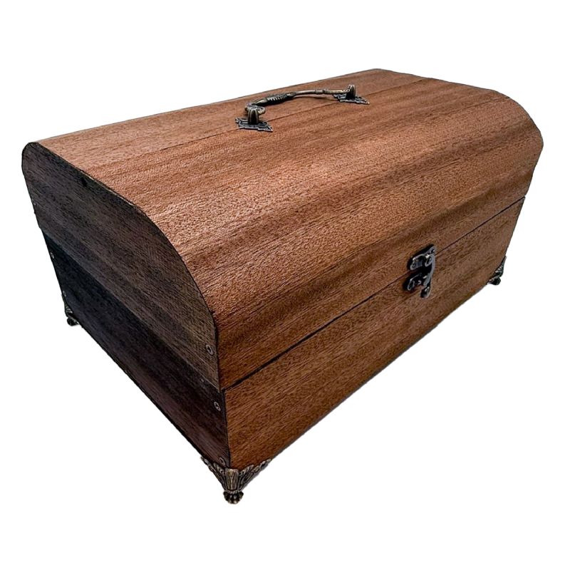 Los herrajes metálicos del cofre y las patas decoradas completan el conjunto con un aire tradicional.