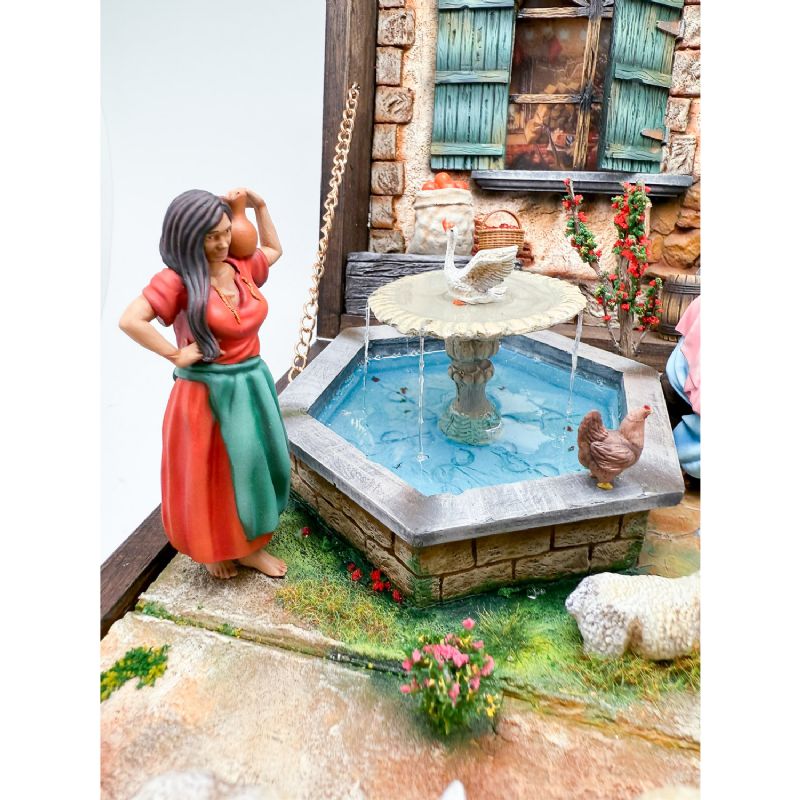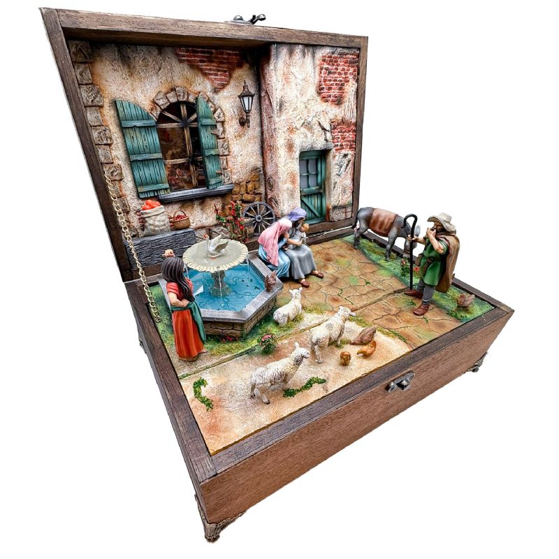 Cofre decorativo con nacimiento artesanal integrado, representando una escena rural con fuente central y figuras en torno al portal.