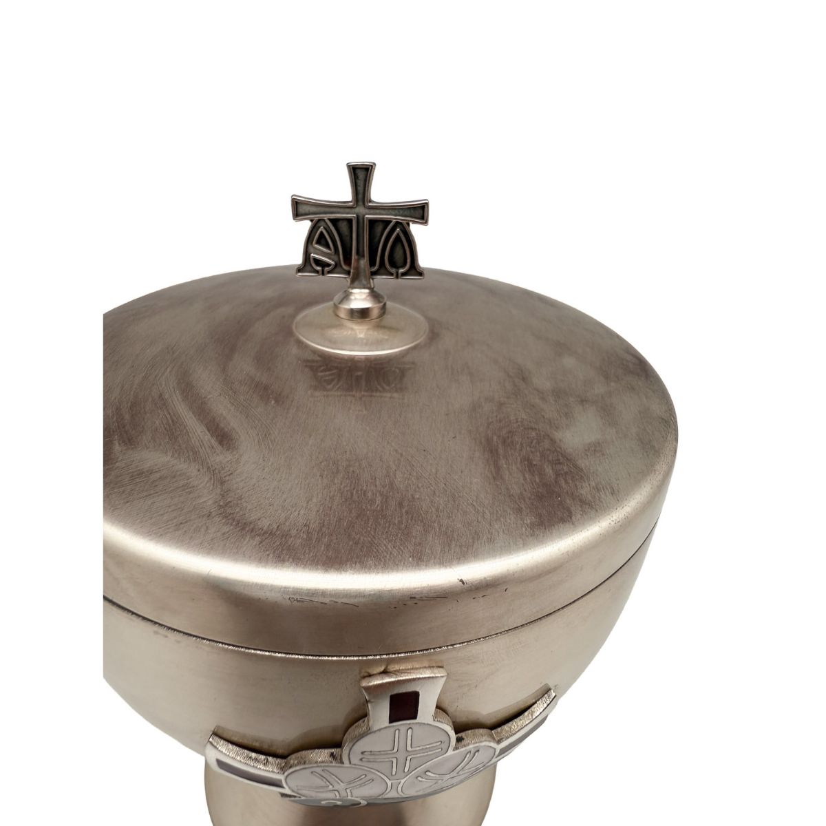 Fabricado en metal plateado de alta calidad, este copón destaca por su acabado uniforme y resistente.