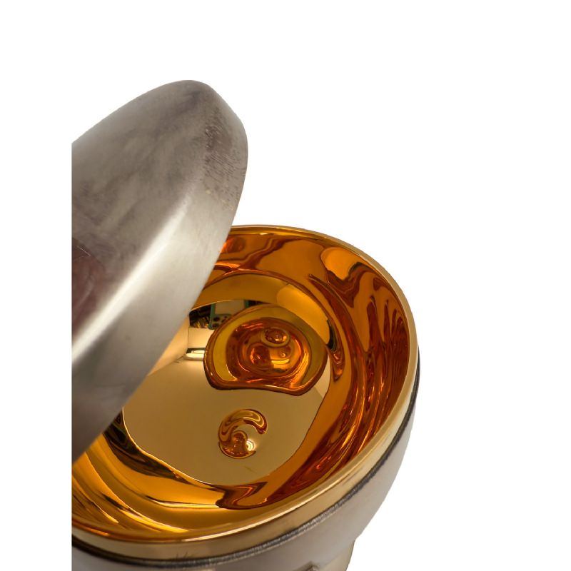 Copón litúrgico de diseño contemporáneo, realizado en España por los prestigiosos talleres de Artesanía Sacra, reconocidos como algunos de los mejores orfebres del mundo.