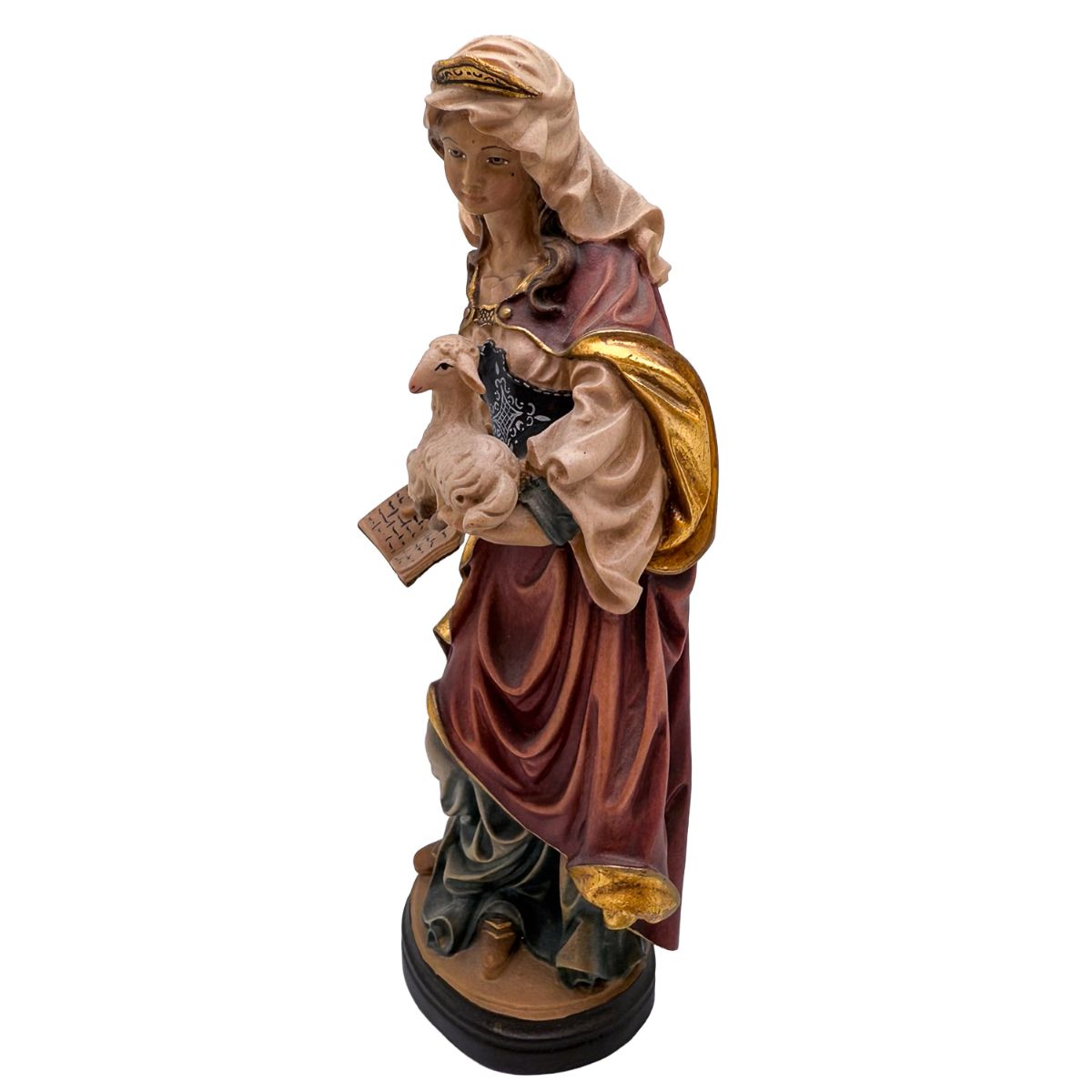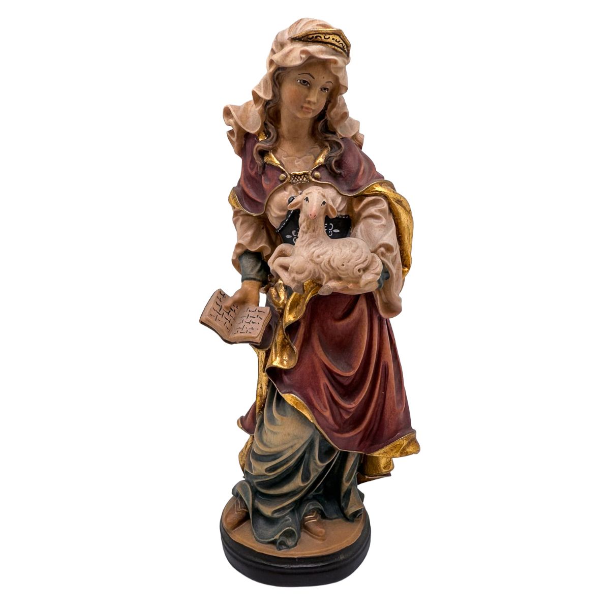 Se encuentra en la ficha del producto Santa Inés - talla de madera Val Gardena con referencia EA-SANTA-1.
