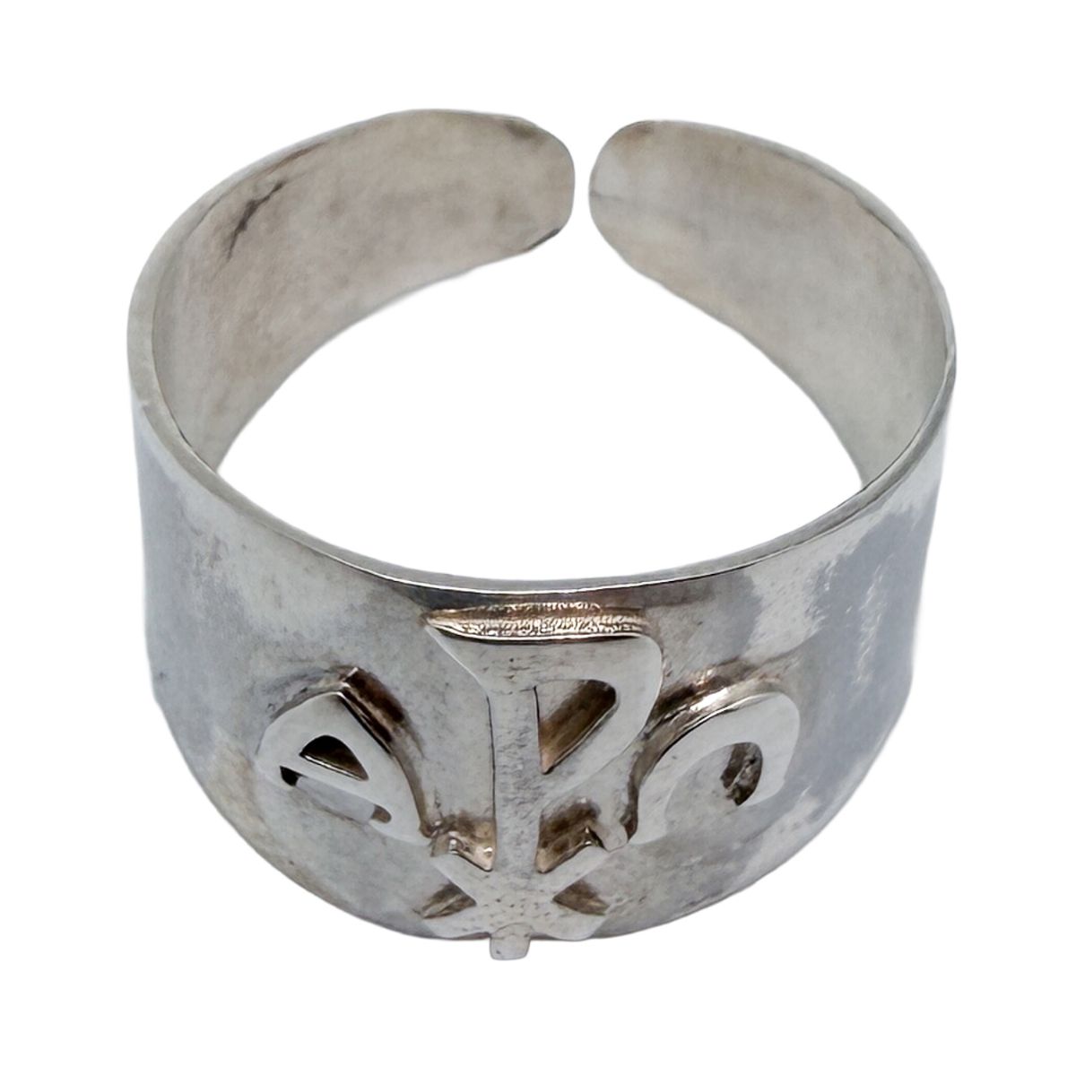 El crismón aparece en relieve central, integrado de manera continua en el cuerpo del anillo, con las letras Alfa y Omega claramente definidas a ambos lados, creando una composición equilibrada y de lectura inmediata.