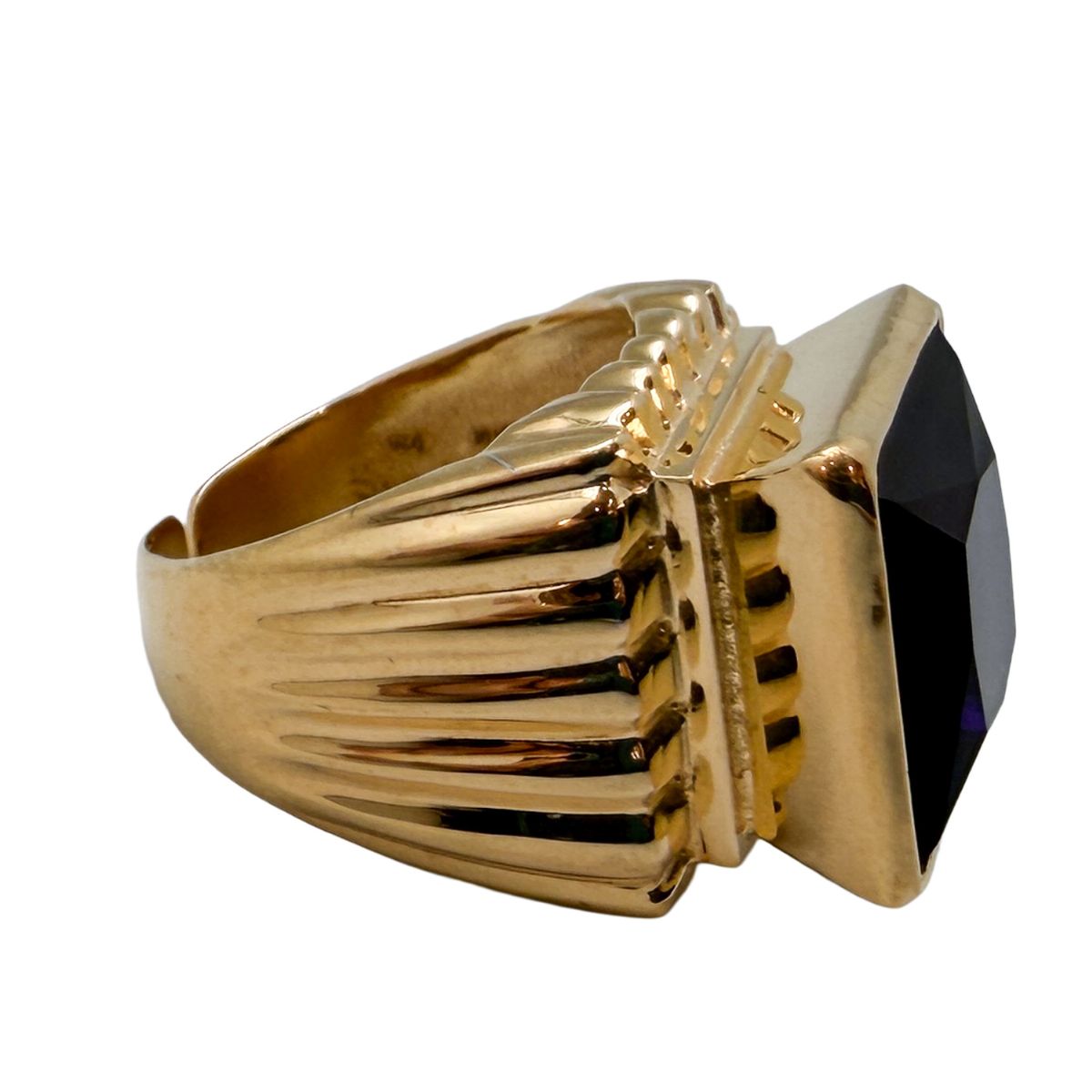 El anillo incorpora una piedra sintética de color púrpura oscuro, tallada en forma cuadrada y facetada, engastada en una montura robusta de líneas rectas.