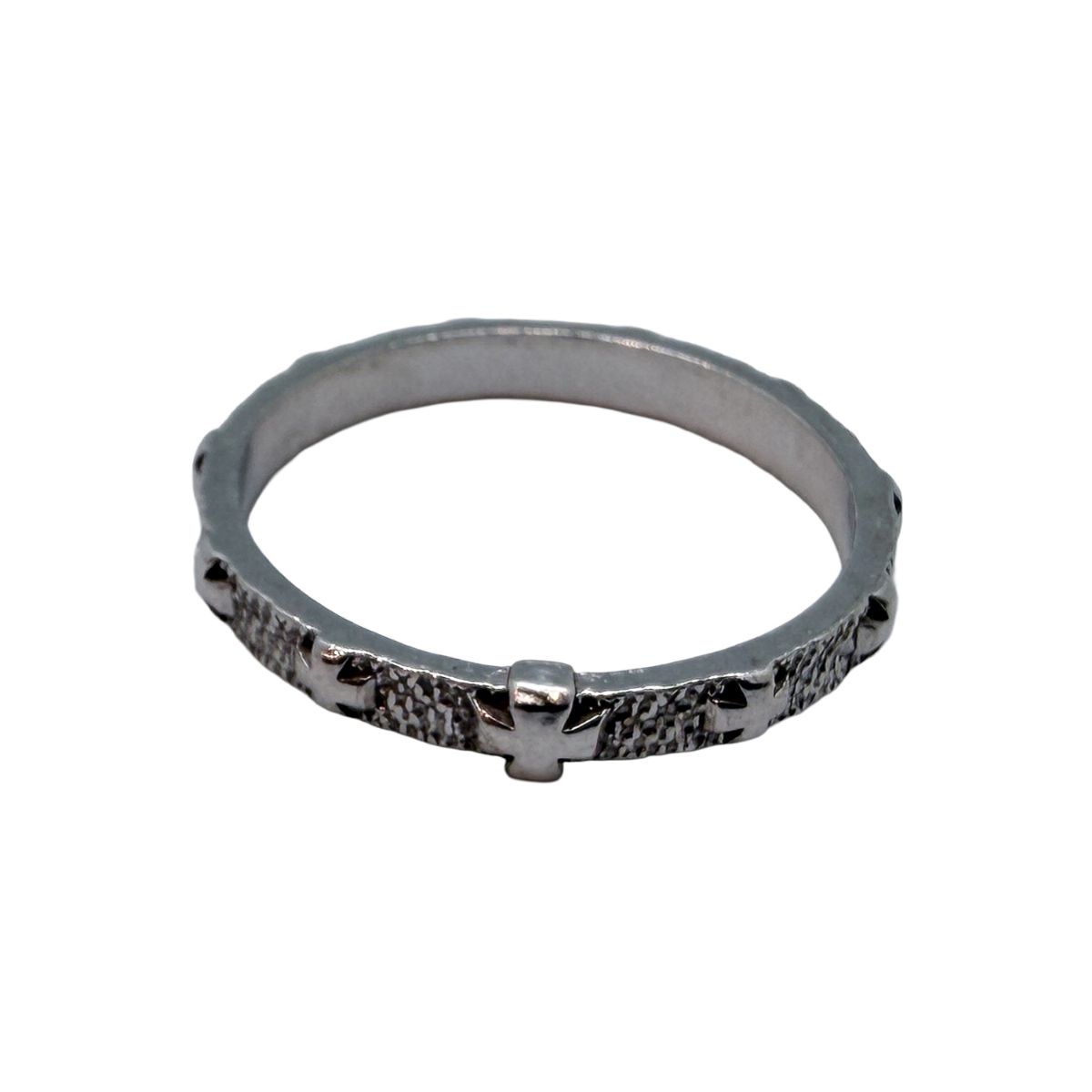 La sucesión de pequeñas cruces en relieve a lo largo del aro permite acompañar el rezo de forma discreta, manteniendo una estética limpia y equilibrada.