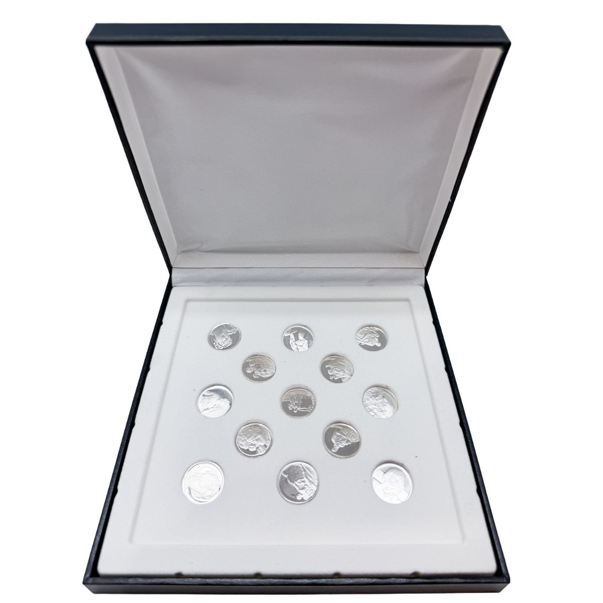El conjunto se presenta en estuche rígido, con interior acolchado y disposición ordenada de las trece monedas, que facilita su conservación y presentación durante la ceremonia.