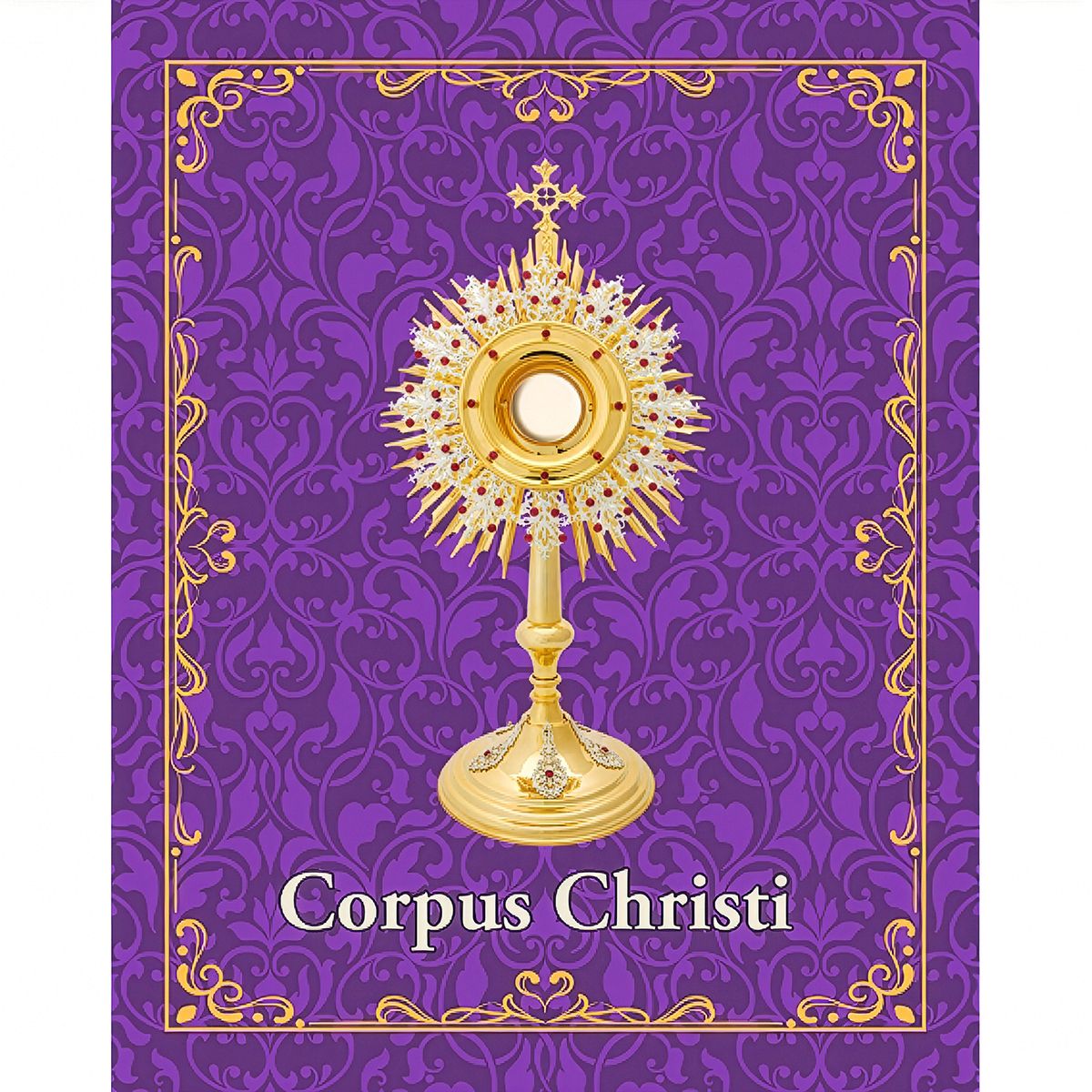 Balconera decorativa dedicada a la solemnidad del Corpus Christi, con diseño central de custodia eucarística sobre fondo ornamental en color morado.