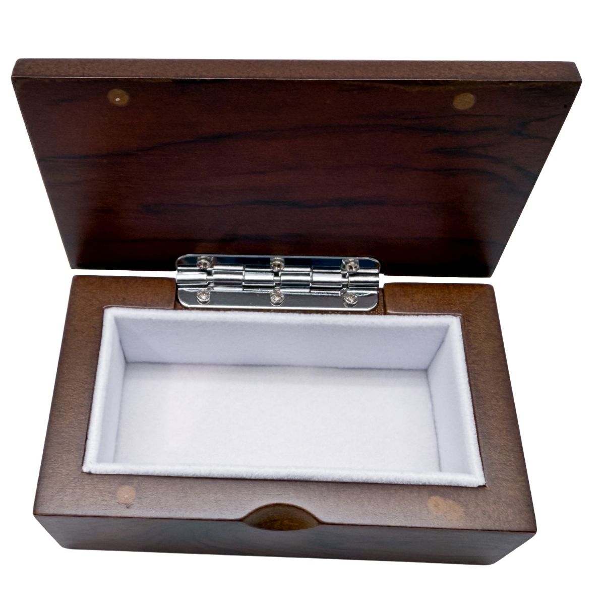 Caja de madera con tapa adornada con placa de plata, diseñada especialmente para guardar las arras de boda.