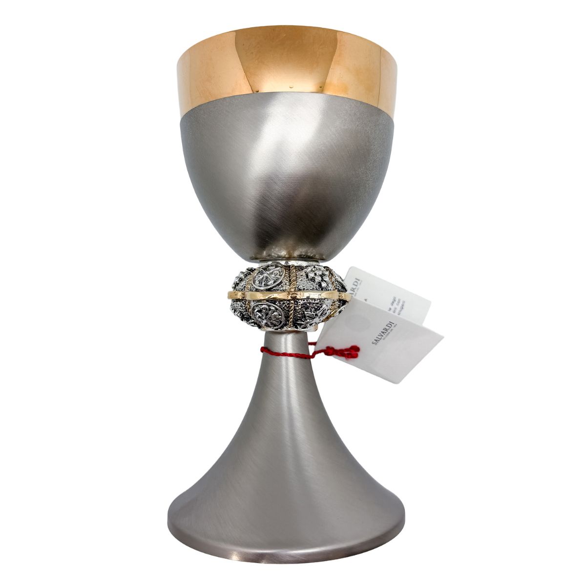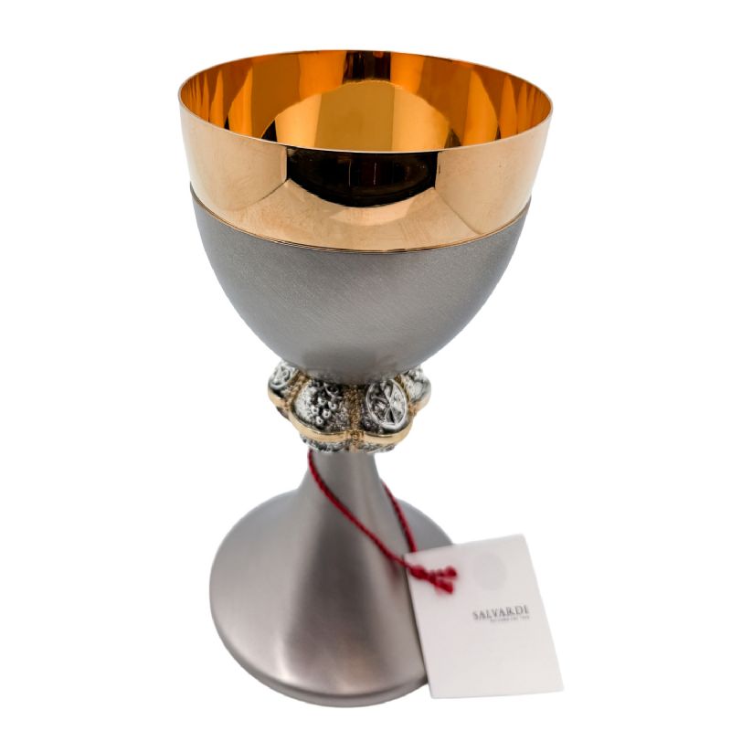 La copa interior está dorada, cumpliendo los requisitos litúrgicos para el contacto con el vino consagrado.