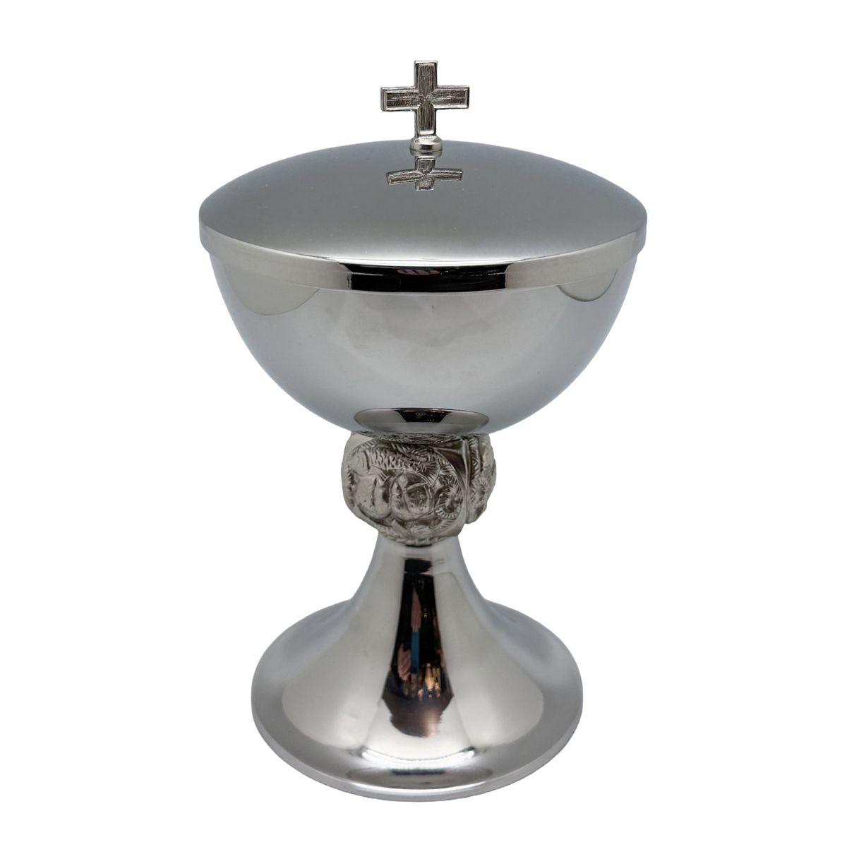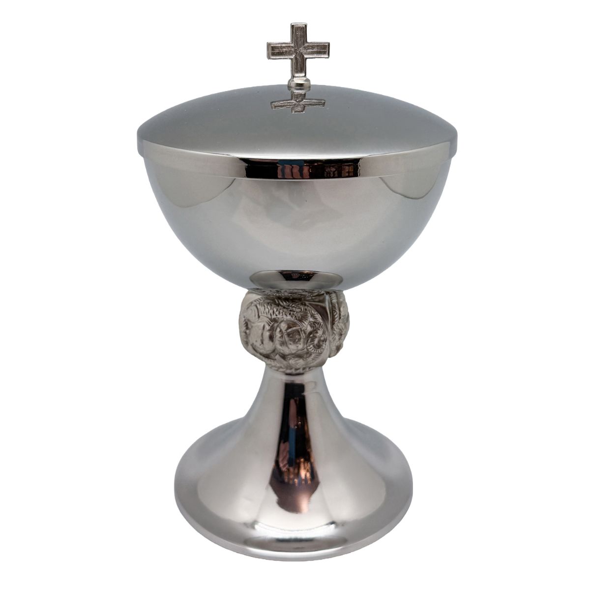 Los copones se presentan con tapa ajustada y nudo ergonómico, mientras que los cálices destacan por sus bases sólidas y copas perfectamente equilibradas. Las patenas, de forma cóncava o plana, se fabrican en distintos diámetros, pulidas a espejo o con borde biselado, según el estilo del conjunto.