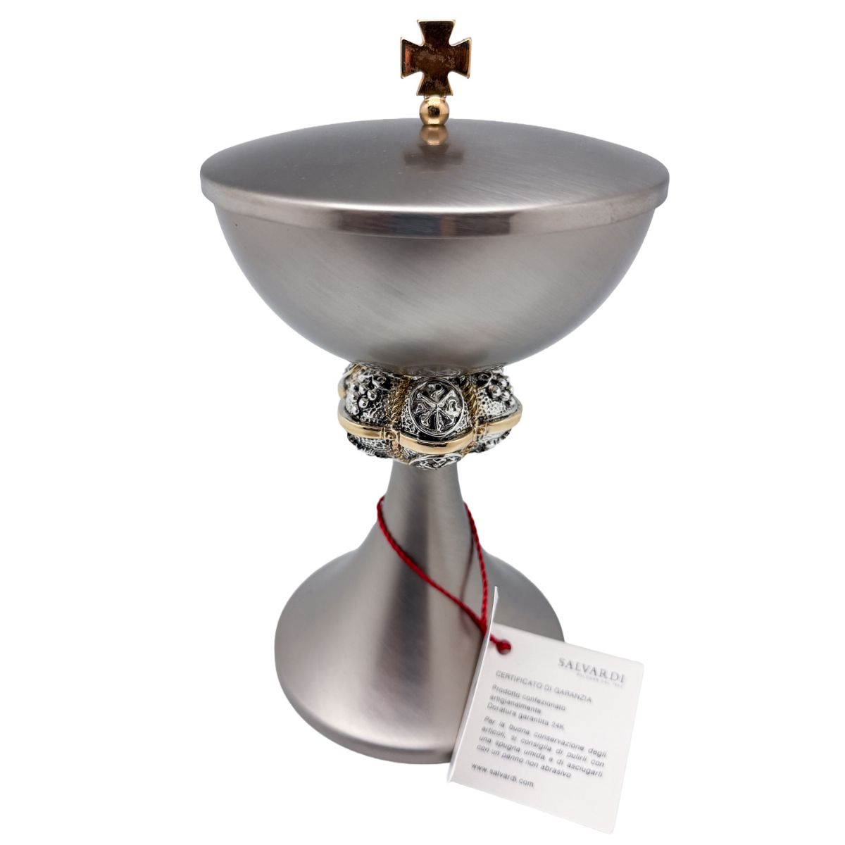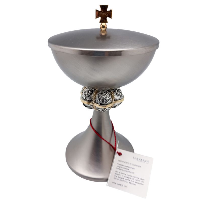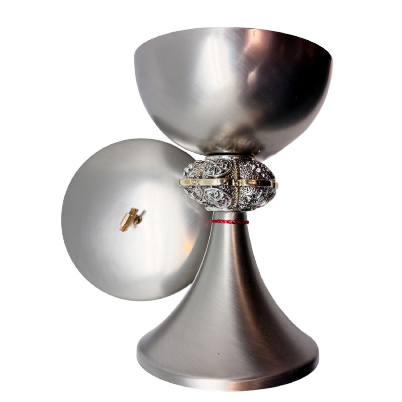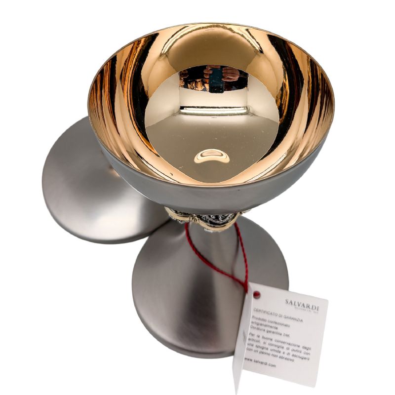 El contraste entre el cuerpo plateado mate y la copa interior dorada aporta una presencia elegante y contenida, muy adecuada para celebraciones ordinarias y solemnes.