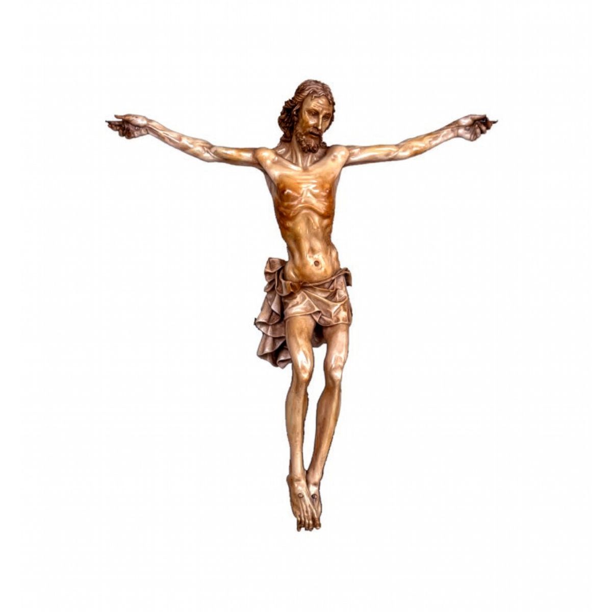 El modelado anatómico es contenido y elegante, con especial atención al torso, los brazos extendidos y el paño de pureza, tratado con pliegues suaves y naturales.