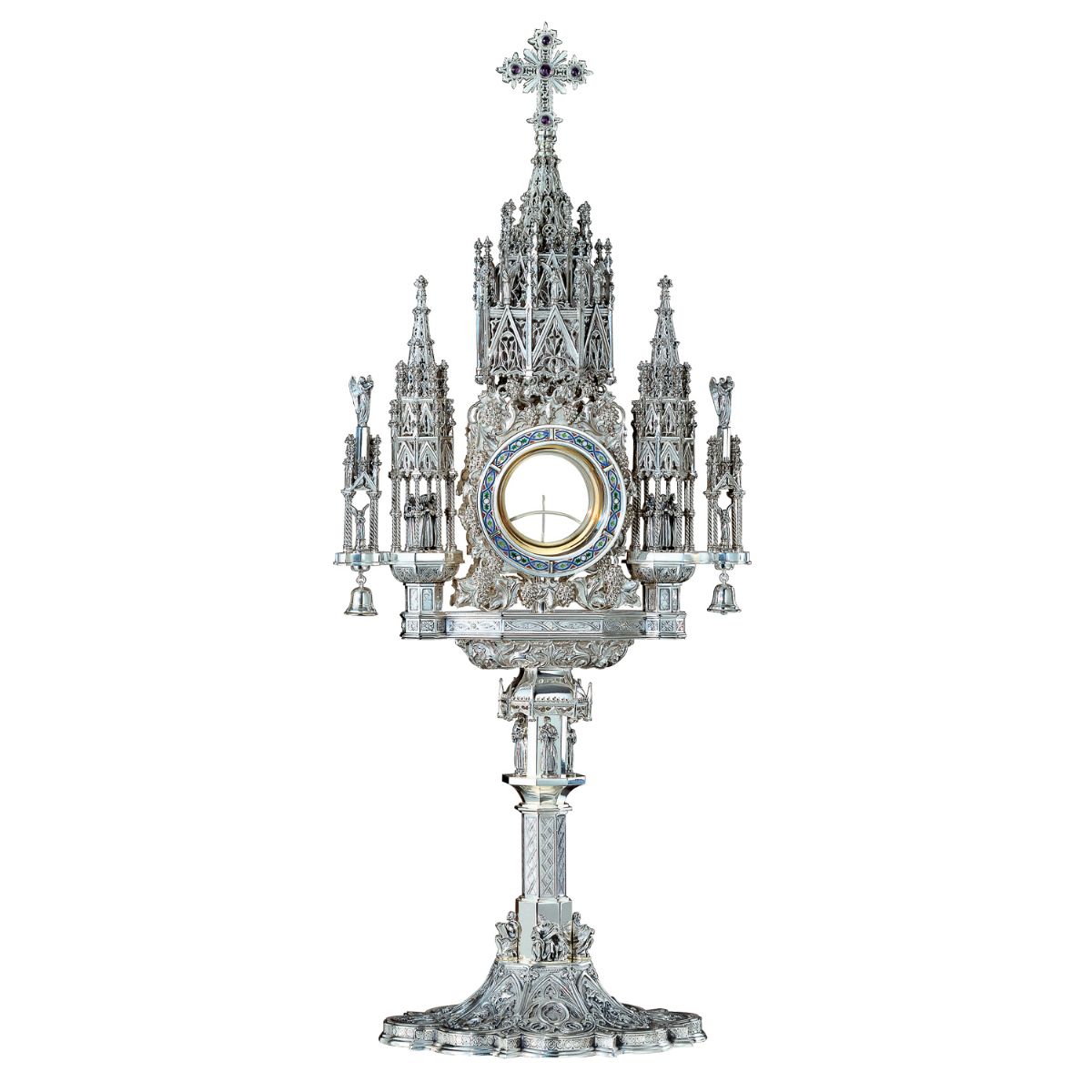 Custodia de estilo gótico realizada en plata de ley, con una imponente arquitectura vertical inspirada en las grandes catedrales medievales.