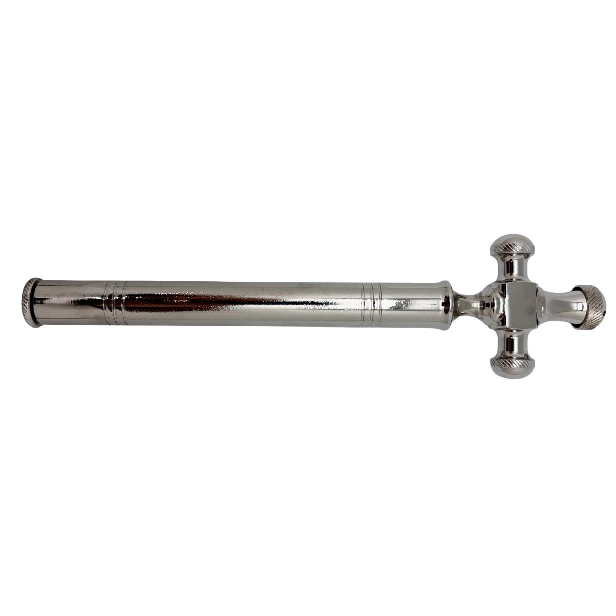 Hisopo litúrgico de diseño clásico, con empuñadura en forma de cruz y líneas limpias, pensado para el rito de la aspersión con agua bendita.