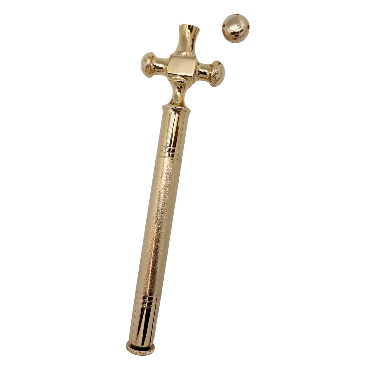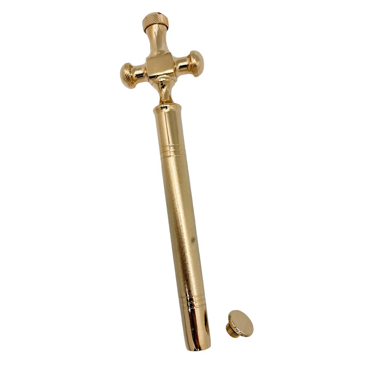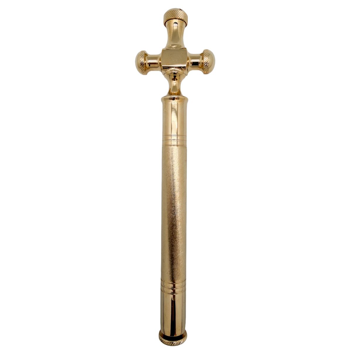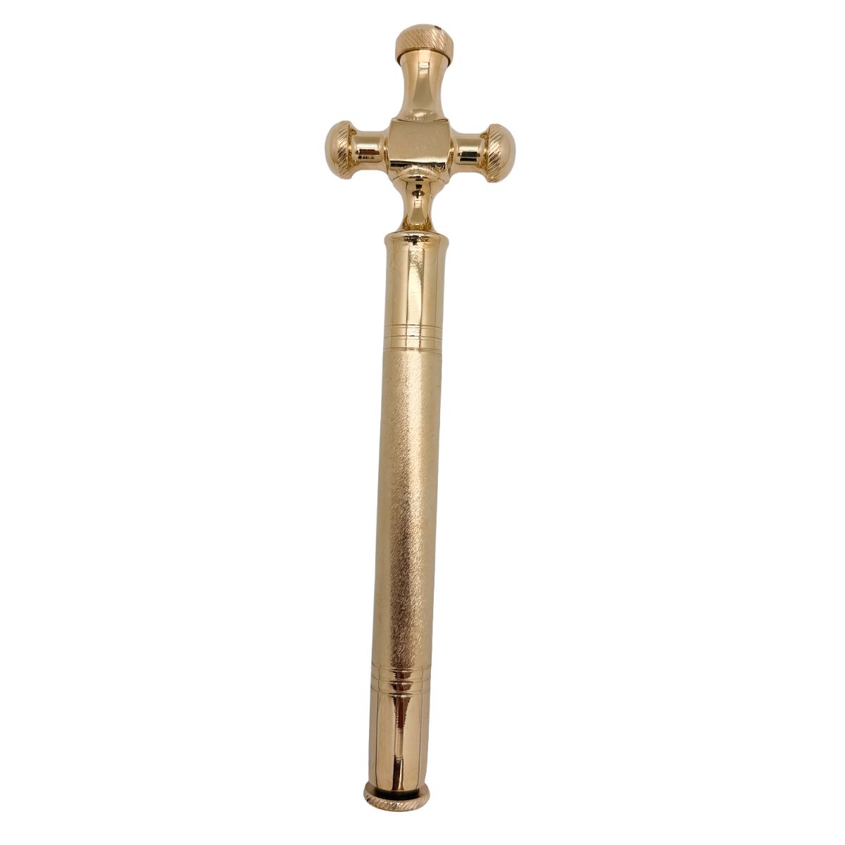 Hisopo litúrgico dorado con cruz, de factura italiana, robusto y funcional, concebido para un uso digno y continuado en la liturgia.