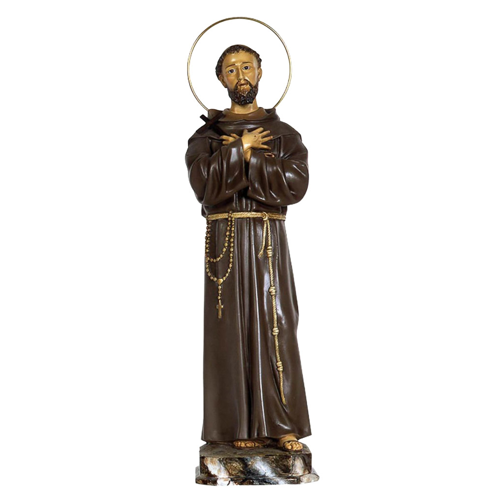 Modelada en pasta de madera y pintada completamente a mano, esta imagen presenta a San Francisco con hábito marrón, cordón con nudos franciscanos y rosario colgado al costado.