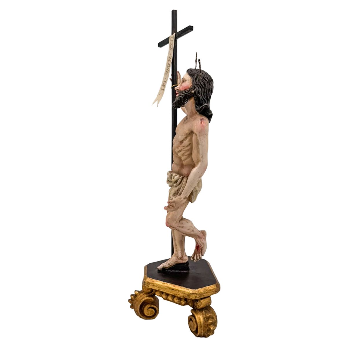 La imagen se apoya sobre una base decorativa de inspiración clásica con detalles dorados, que refuerza su presencia artística y permite colocarla fácilmente en altar o vitrina.