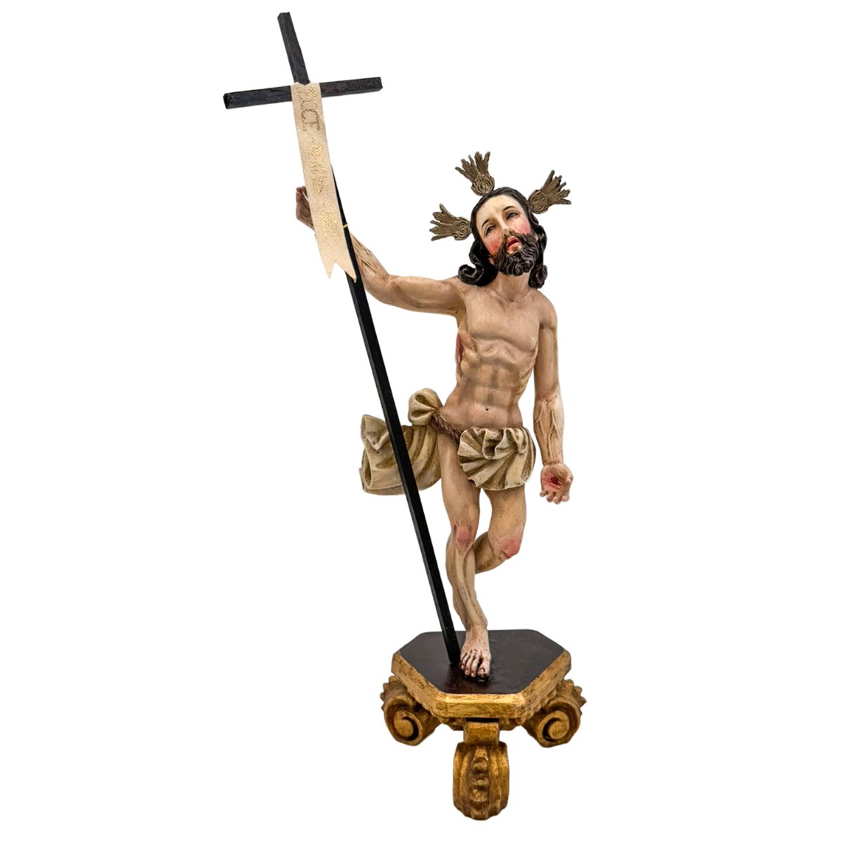 Una representación elegante y expresiva de Jesús Resucitado que une belleza artística y profundo significado espiritual, perfecta para presidir un espacio de oración o devoción.