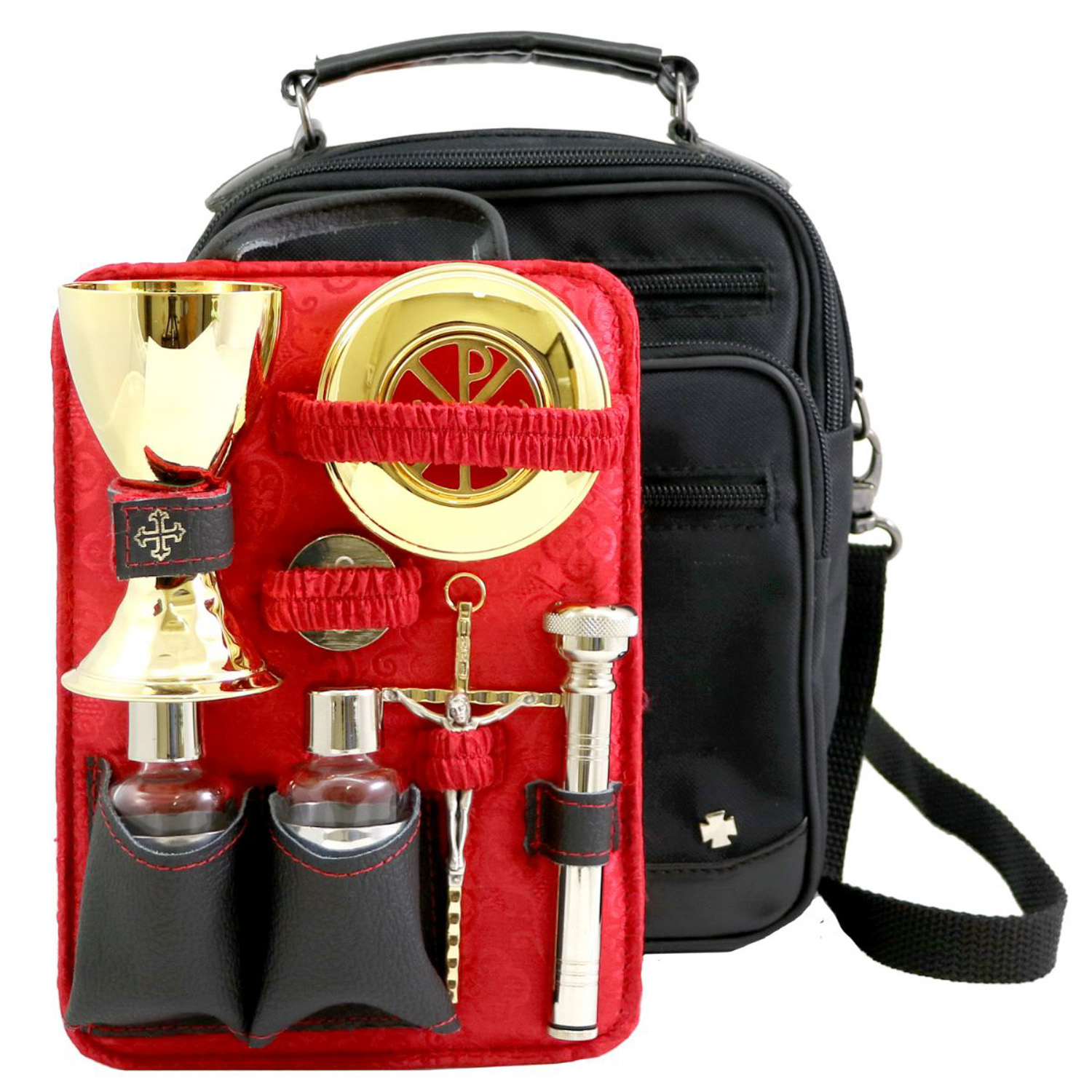 Cada maletín sacerdotal contiene los elementos necesarios para la administración de los sacramentos, organizados con compartimentos específicos. Según el modelo, pueden incluir cáliz, patena y copón en metal dorado o plateado, vinajeras para vino y agua, crismeras para los santos óleos, purificador, corporal y manutergio, crucifijo, estola y concha de bautismo, además de velas o cirios pequeños.