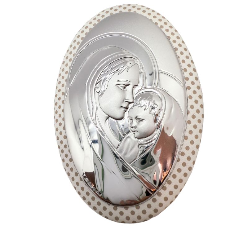 Delicada medalla de cuna con la imagen de la Virgen María con el Niño Jesús, representada en un suave relieve que transmite ternura y protección.