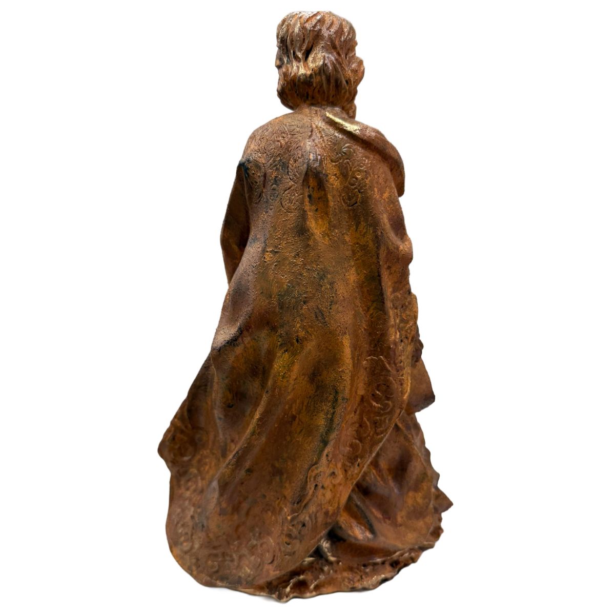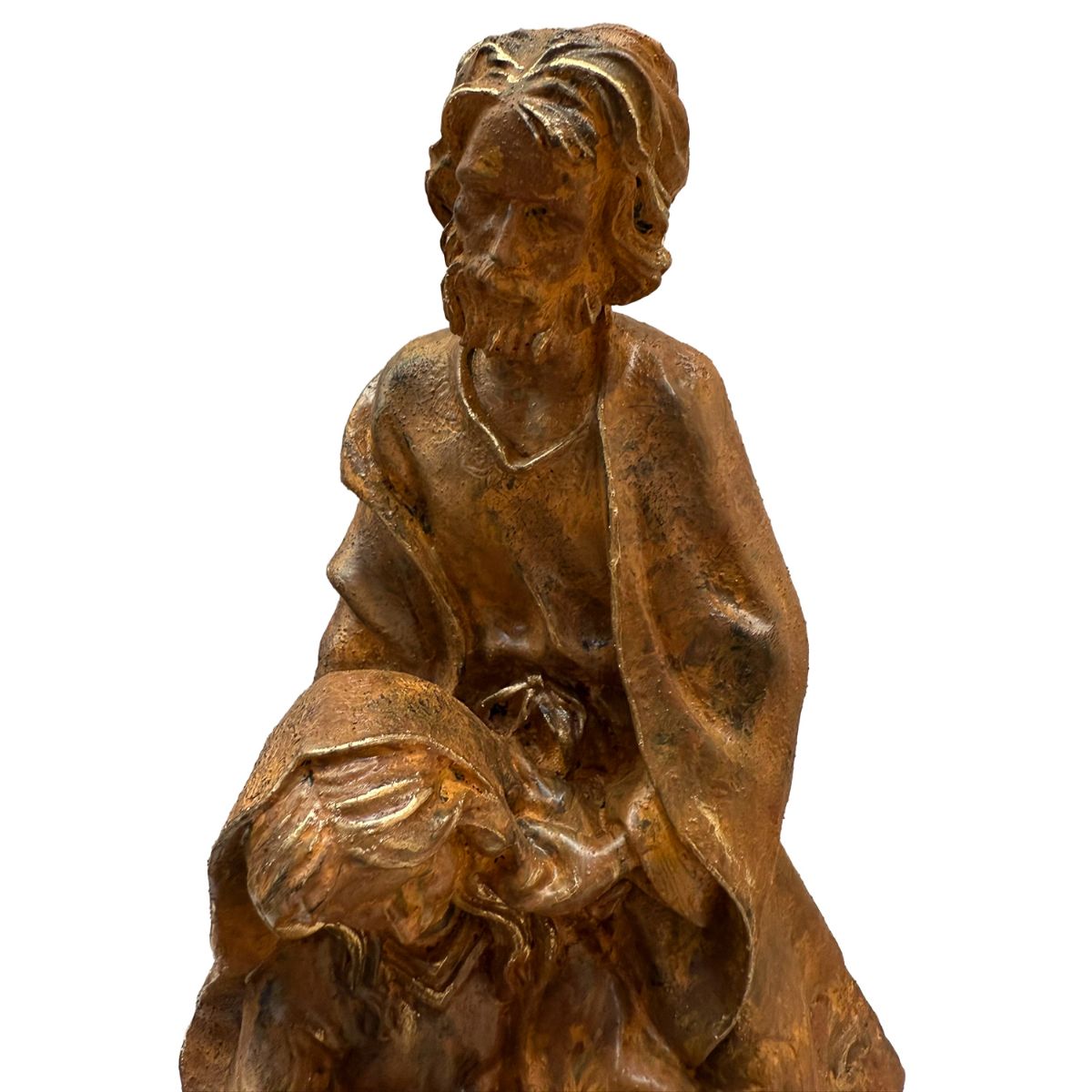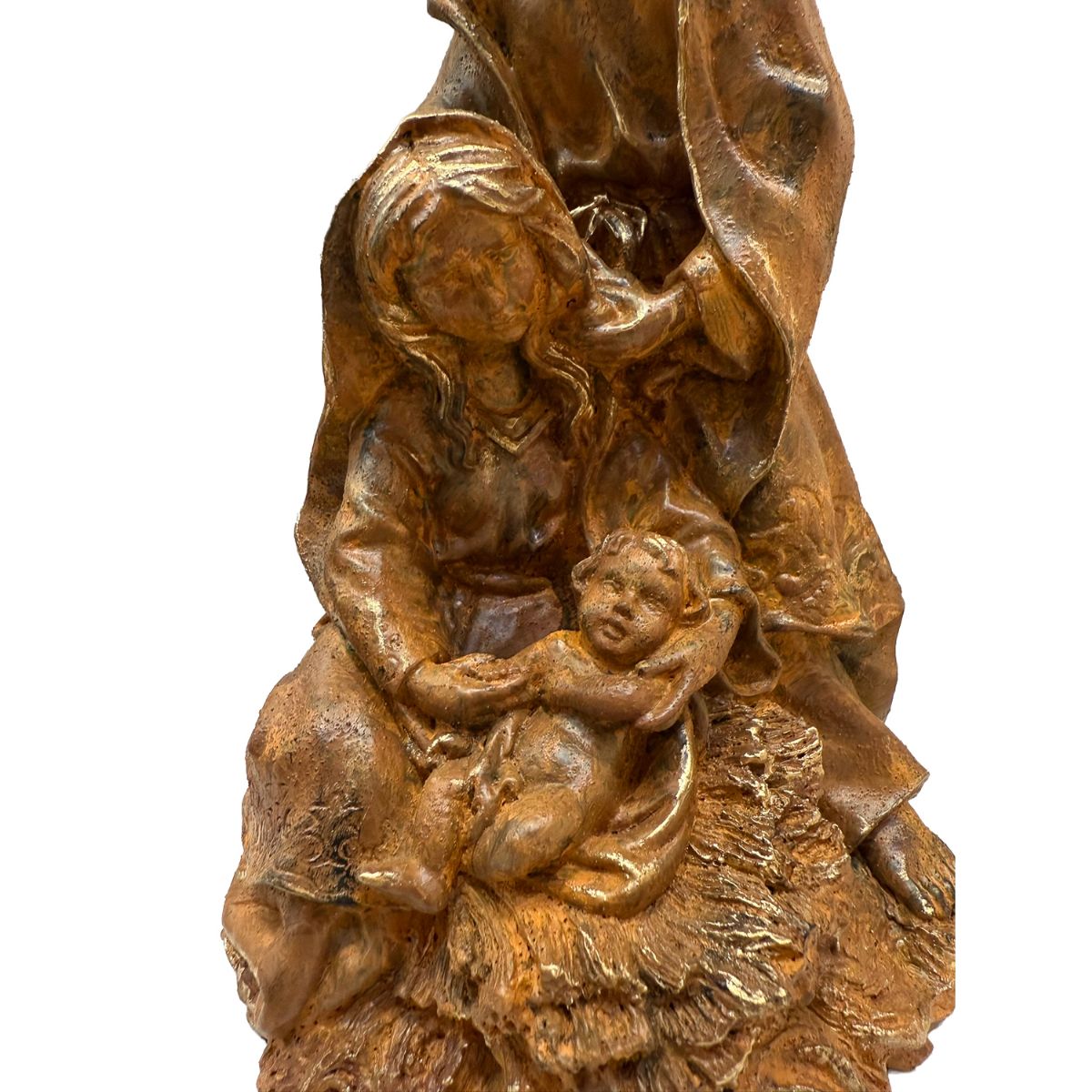 Pieza realizada en piedra artificial, con acabado de tonalidad cálida y efecto envejecido que realza los volúmenes y los pliegues de las vestiduras.