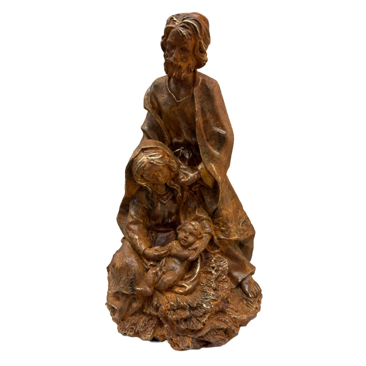 Los misterios del Nacimiento son conjuntos escultóricos que representan la escena central de la Navidad: el nacimiento de Jesús en Belén. En ellos se une el arte con la fe, la belleza con la devoción, invitando al creyente a contemplar el misterio de la Encarnación con recogimiento y alegría. Cada grupo, compuesto por el Niño Jesús, la Virgen María y san José, puede acompañarse de ángeles, animales o figuras complementarias, formando el corazón de todo belén.