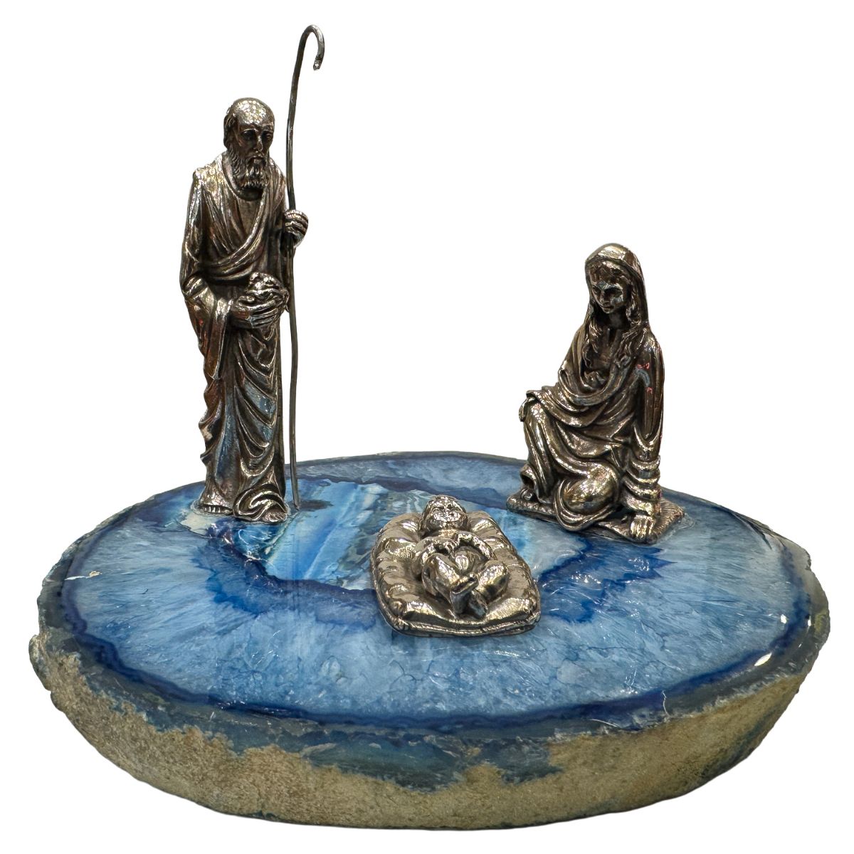 Misterio de Navidad presentado sobre una base natural de piedra ágata, con la Sagrada Familia representada en una composición sobria y elegante.