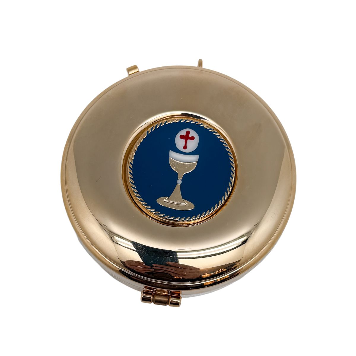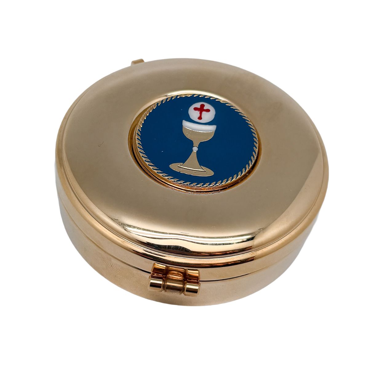 La tapa incorpora un medallón esmaltado con motivo eucarístico (cáliz y hostia), enmarcado por un aro decorativo que realza el conjunto.