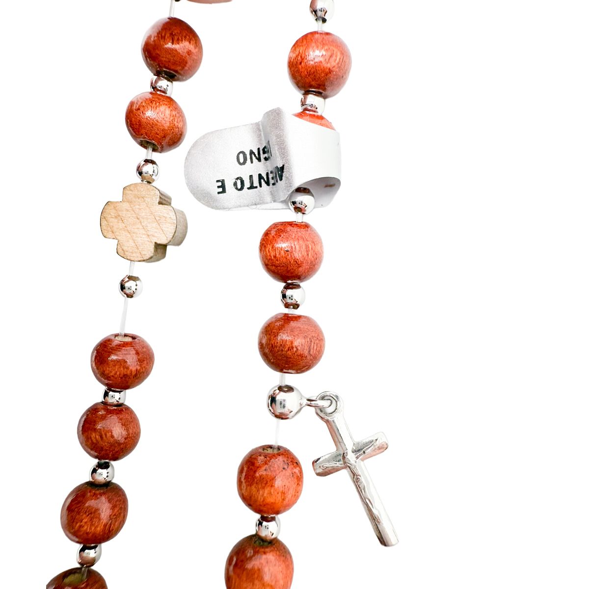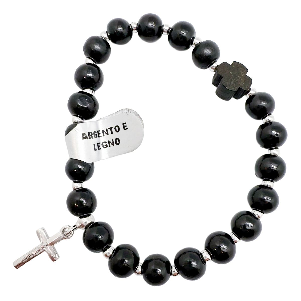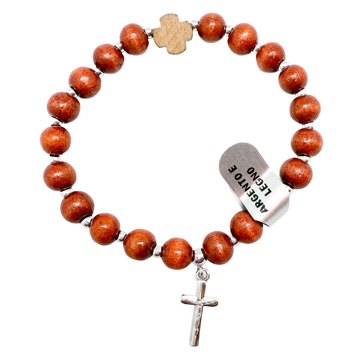 Pulsera religiosa de estilo tradicional que combina la calidez de la madera con el brillo de la plata, formando un conjunto equilibrado y muy expresivo.