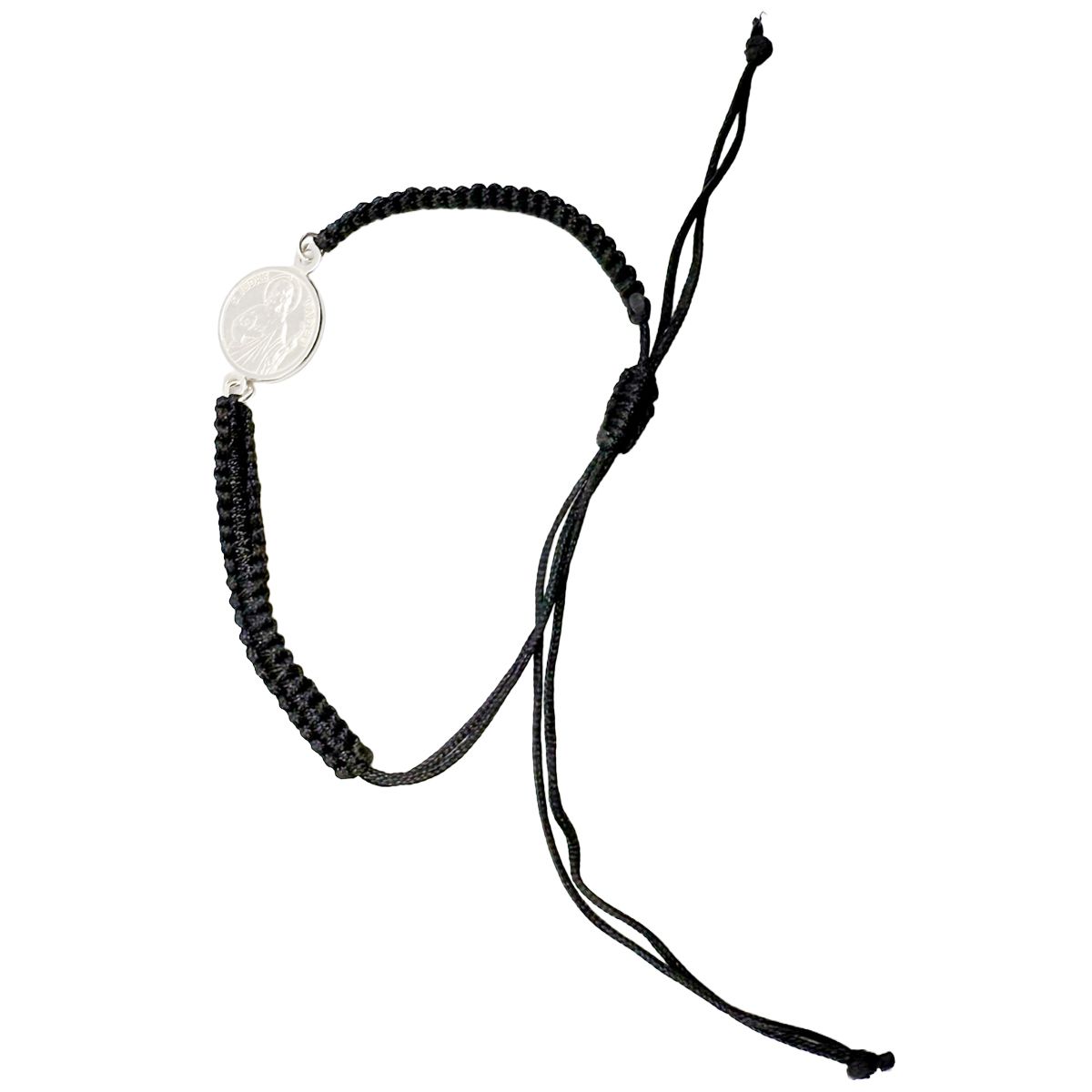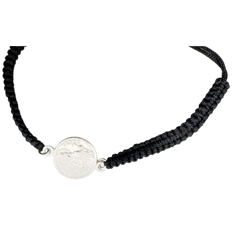 Pulsera religiosa dedicada a San Judas Tadeo, confeccionada en cordón de macramé negro y rematada con medalla central en metal.