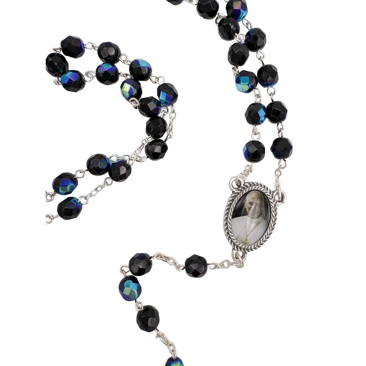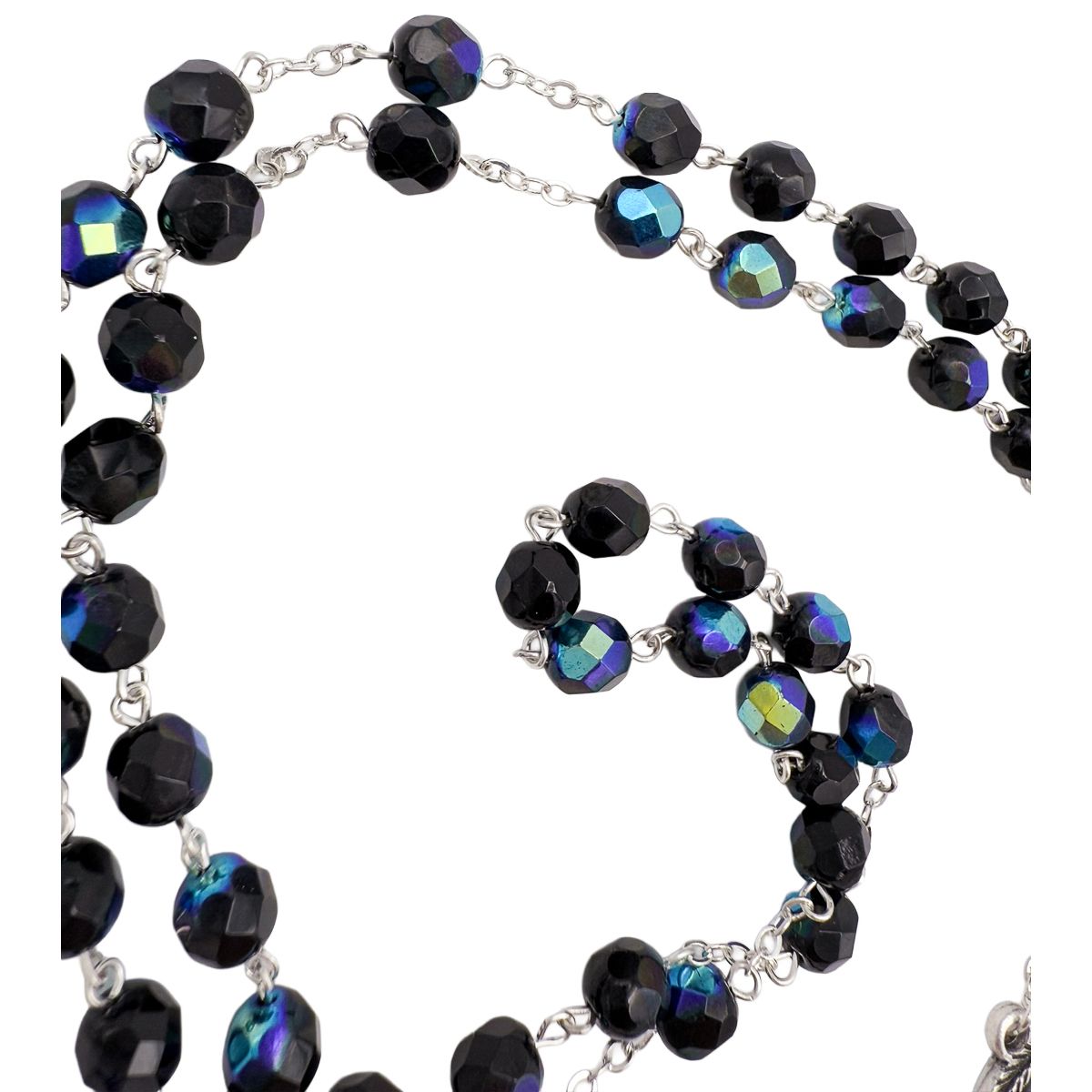 Rosario de estilo elegante y actual, elaborado con cuentas facetadas en color negro con reflejos irisados que aportan profundidad y brillo.