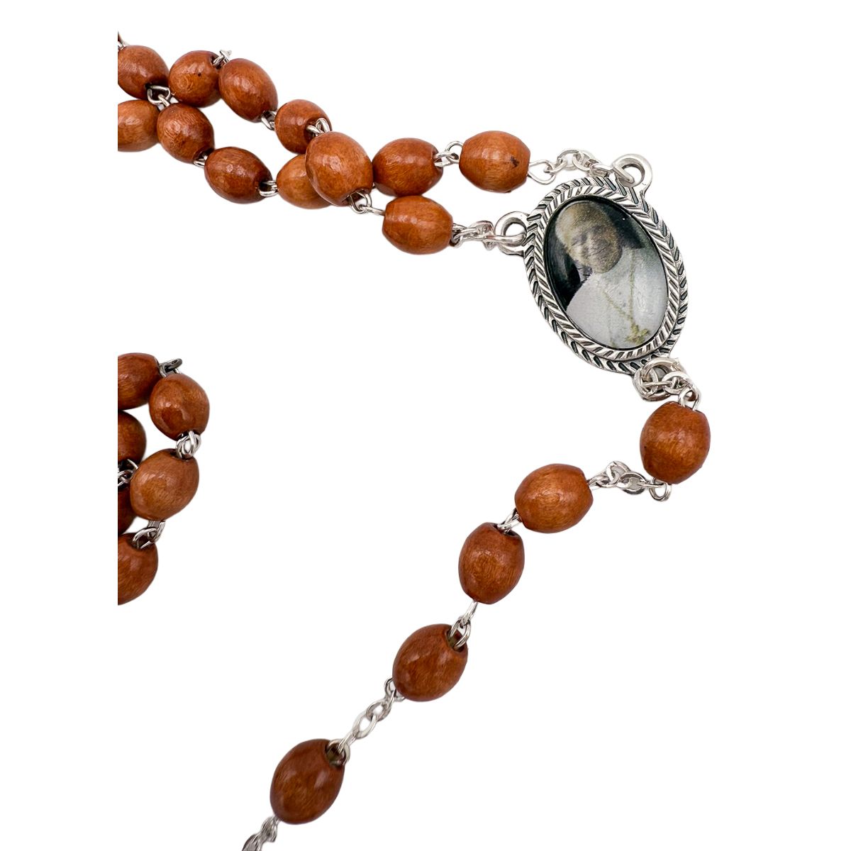 Rosario de estilo clásico elaborado con cuentas de madera ovalada en tono natural, que aportan calidez y sencillez a la pieza.