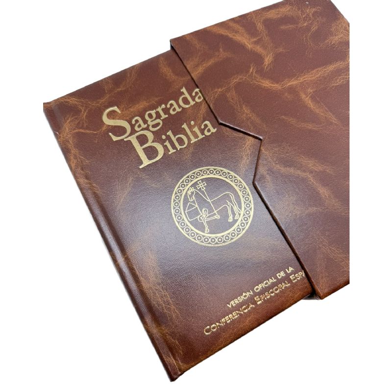 Edición oficial de la Sagrada Biblia de la Conferencia Episcopal Española, encuadernada en elegante formato guaflex color marrón, con grabaciones en oro y estuche protector del mismo material.