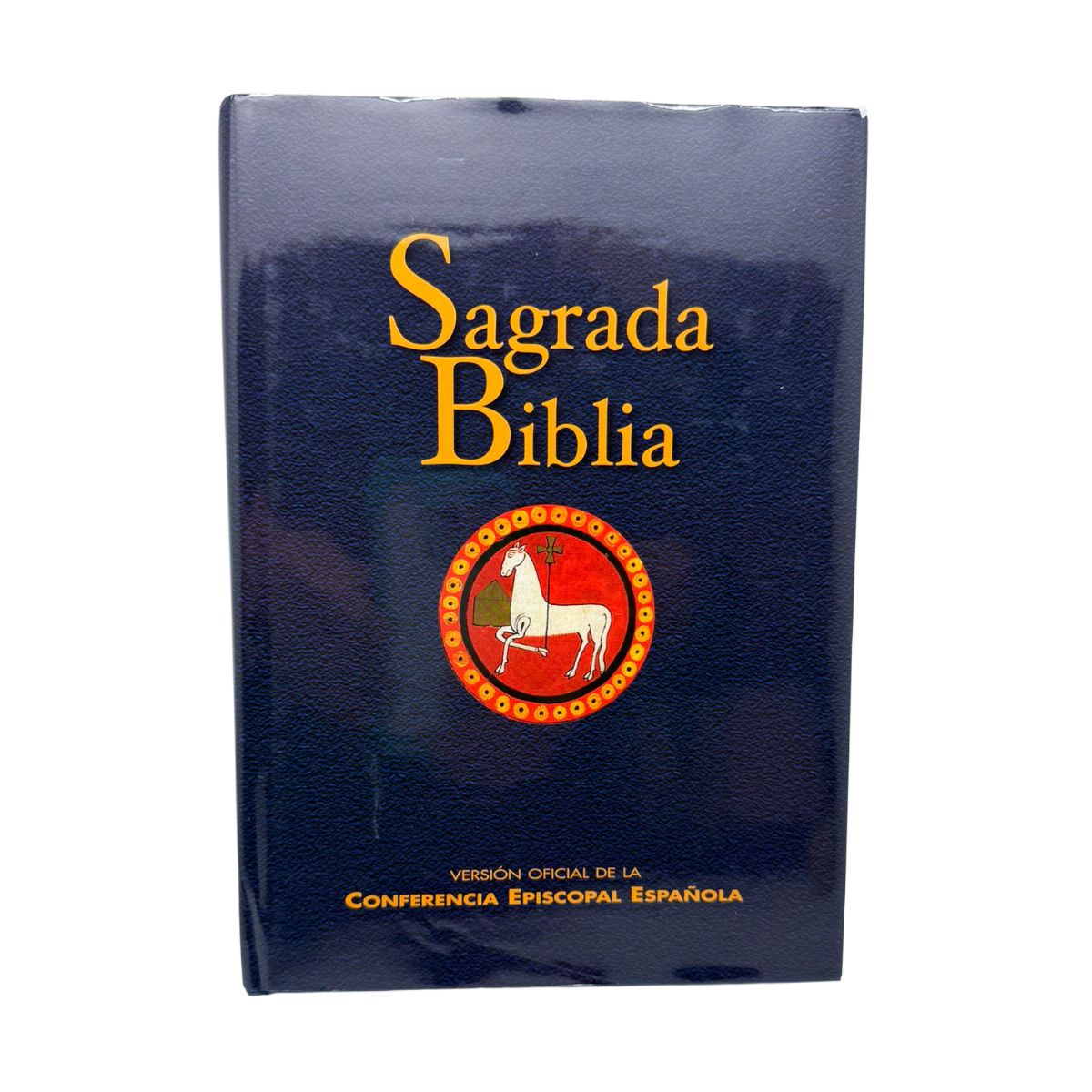 Edición oficial de la Sagrada Biblia publicada por la Conferencia Episcopal Española, presentada en elegante encuadernación de geltex azul marino con el tradicional emblema del Cordero de Dios en la portada.