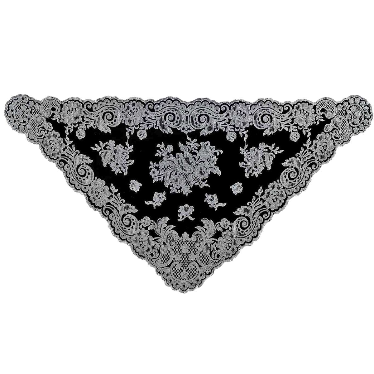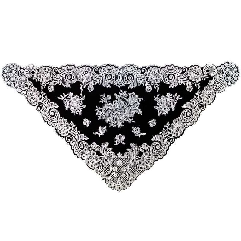 Su diseño en encaje fino presenta un delicado motivo floral, con detalles ornamentales que enmarcan la pieza y realzan su belleza.