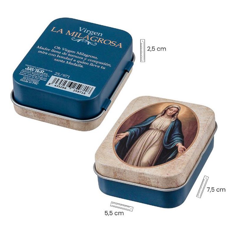 Se encuentra en la ficha del producto Virgen Milagrosa - Figura de resina en lata - 5 cm con referencia 25/971.